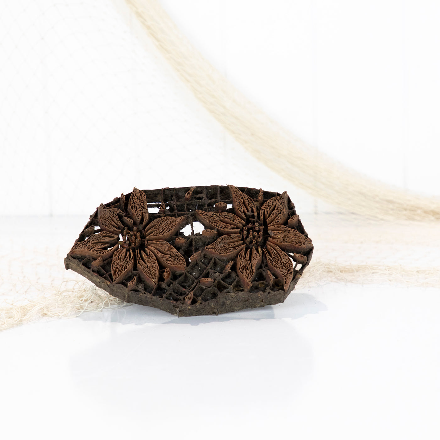 To create traditional batik fabrics the stamp is used to apply wax to fabric before dying, stopping the dye from absorbing where the wax has left a design.