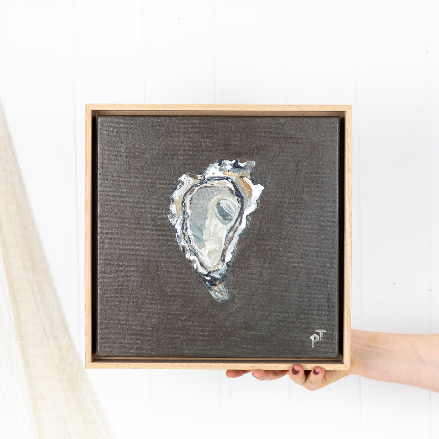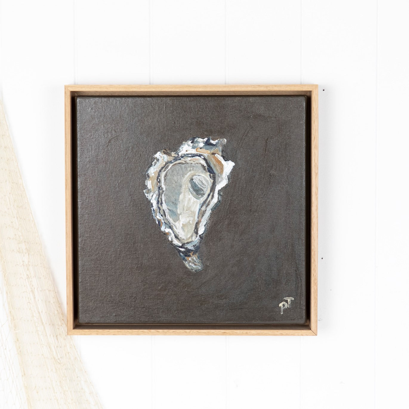 Featuring an open oyster on a deep brown background, it has been beautifully framed in oak and is ready to hang.