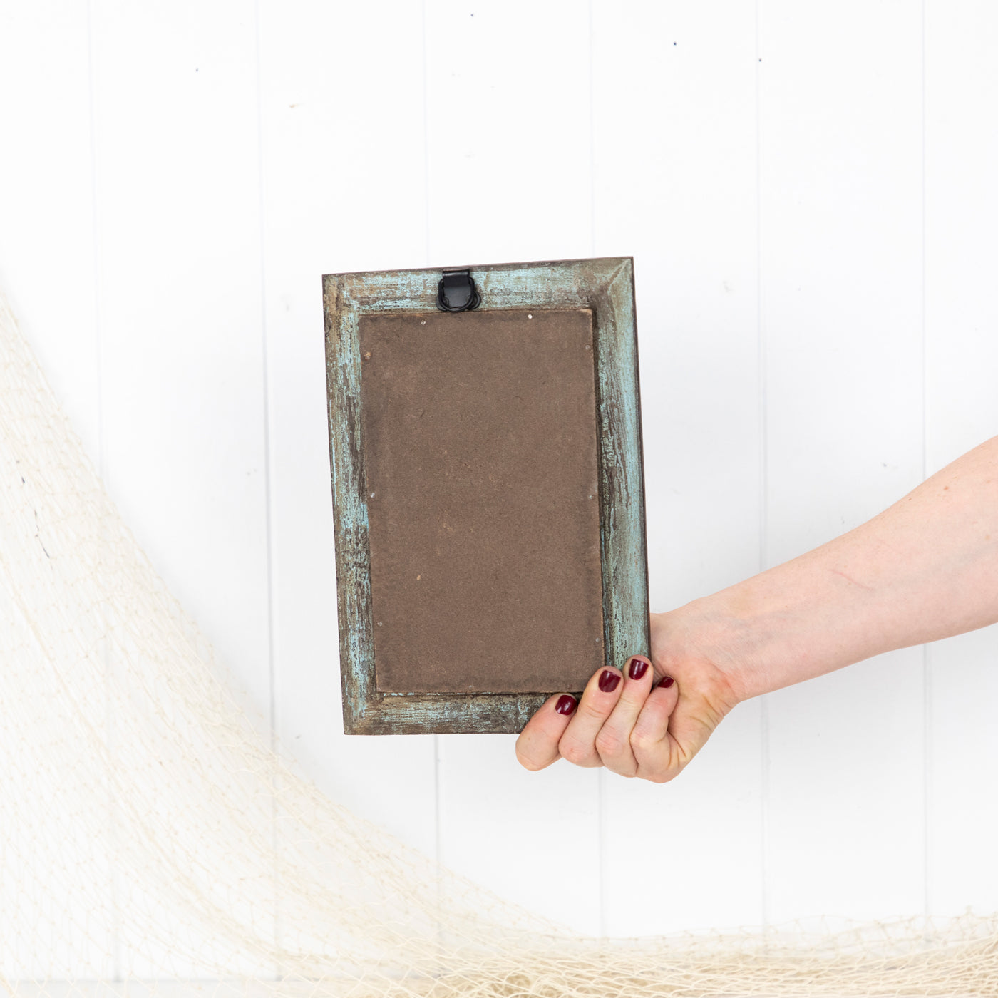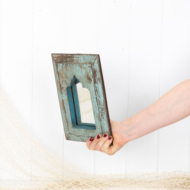 The timber is beautifully aged, with some remnants of past paint colours. Fitted with a hook ready to hang.