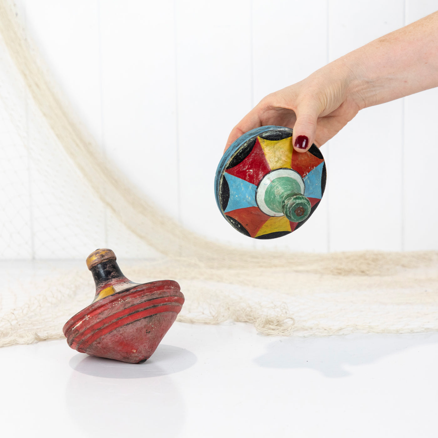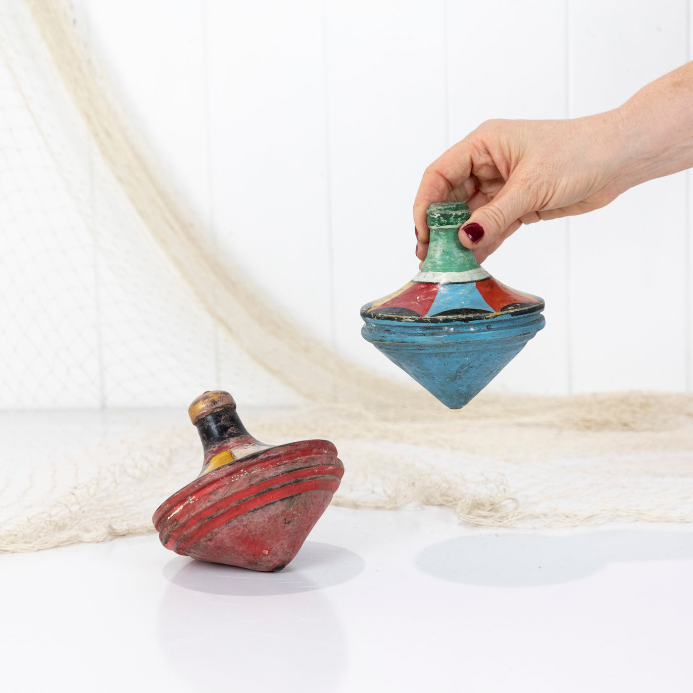 Beautiful handcrafted and painted, they were spun and used in games for skill and competition, representing deep cultural roots in childhood play and artistry.