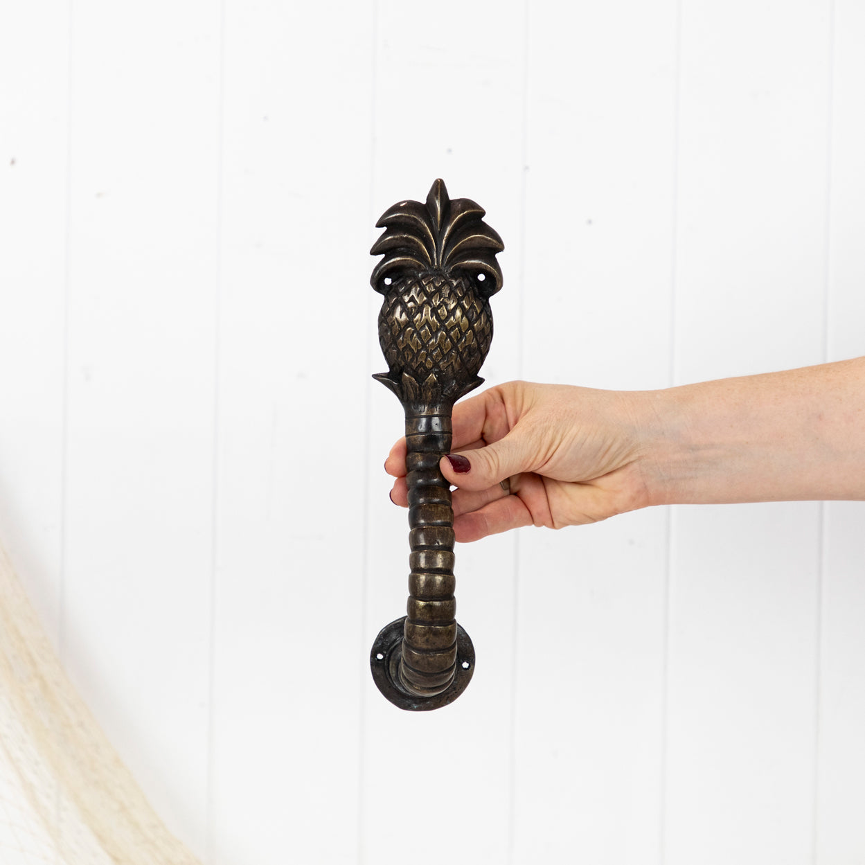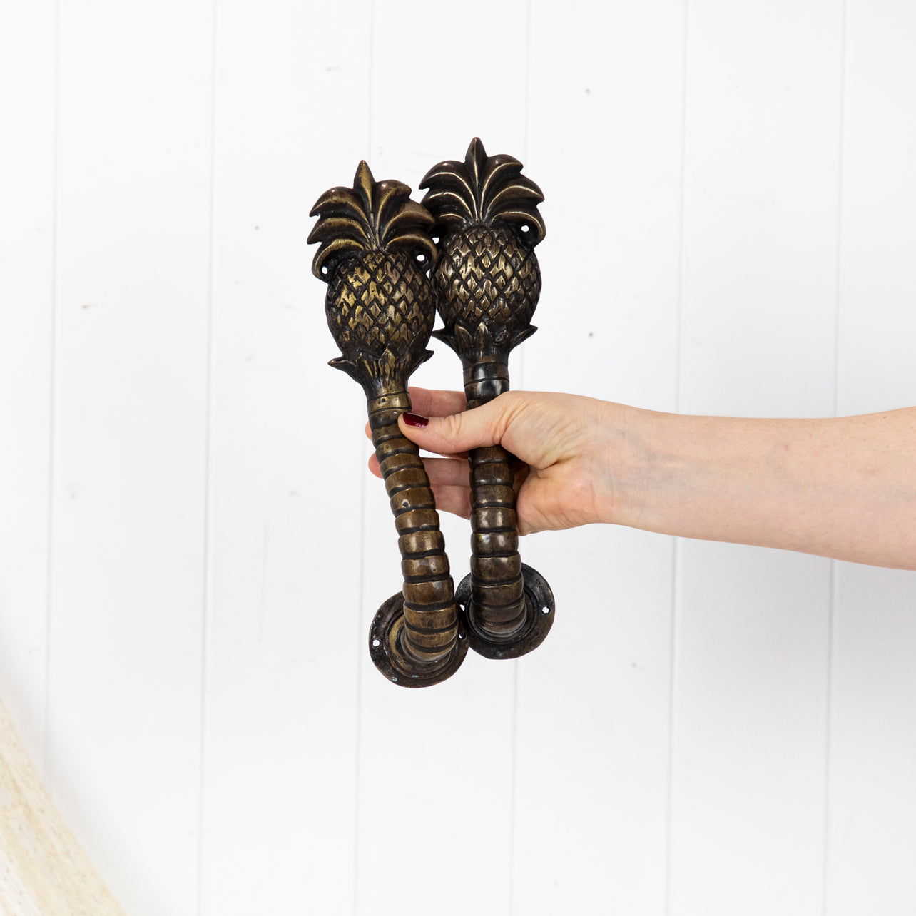 This pair of brass door handles feature a tropical pineapple motif.