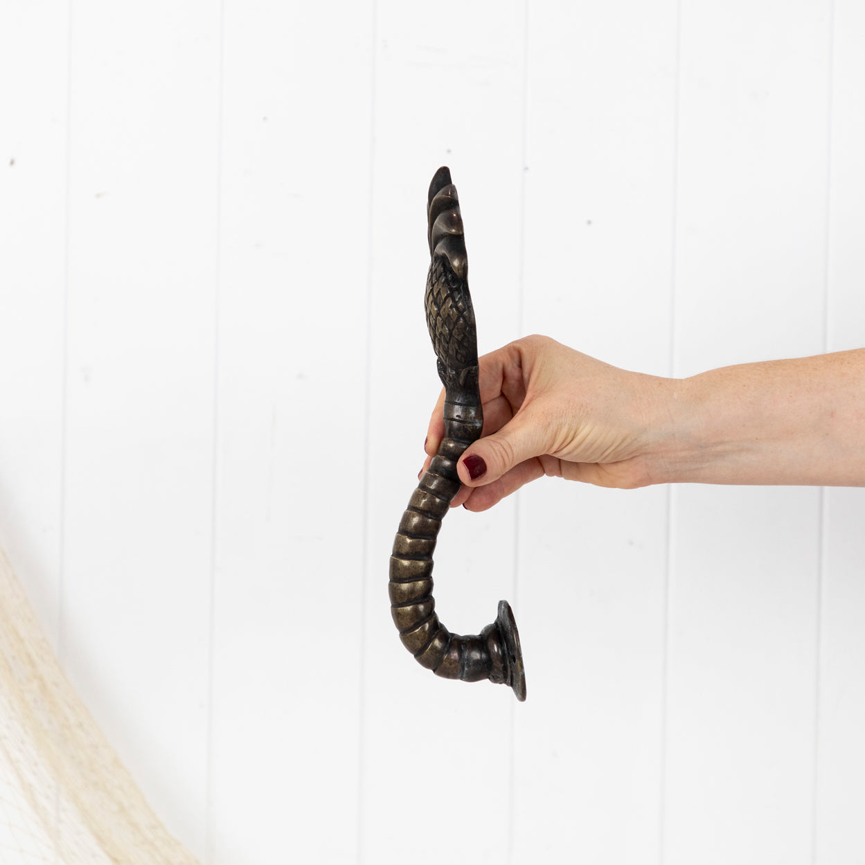 Made from brass it has been aged to a dark finish, with sections polished back to reveal the metals original tone.