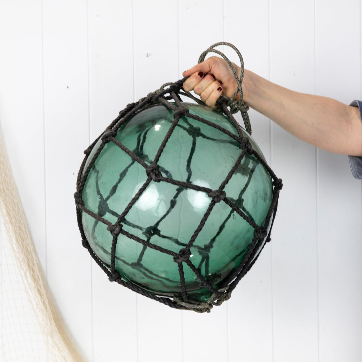 This beautiful old 14" Japanese longline glass float is a stunning colour with grey netting and a maker's mark.