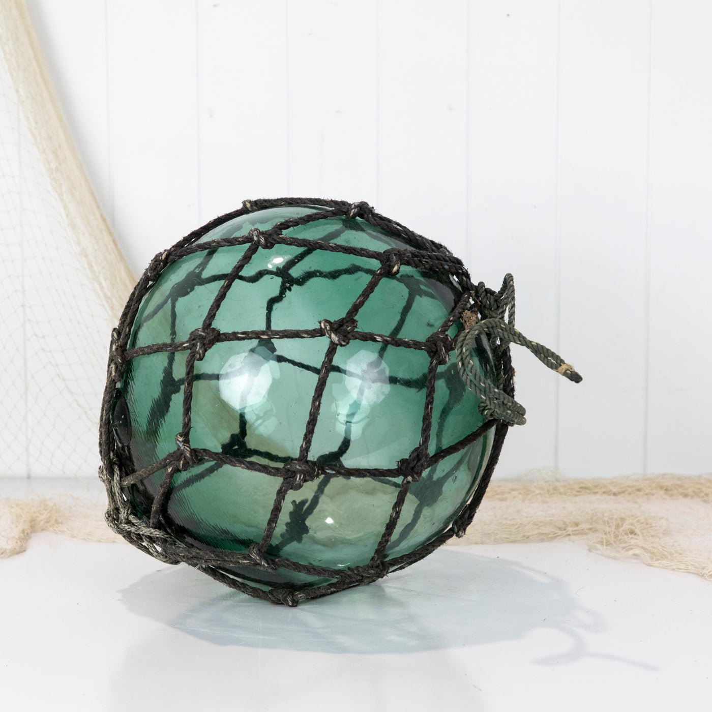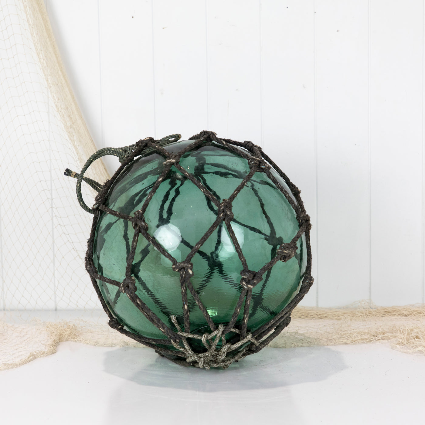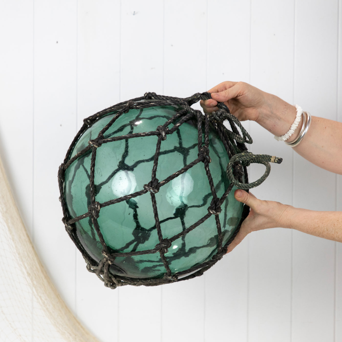 This beautiful old 14" Japanese longline glass float is a stunning colour with grey netting and a maker's mark.