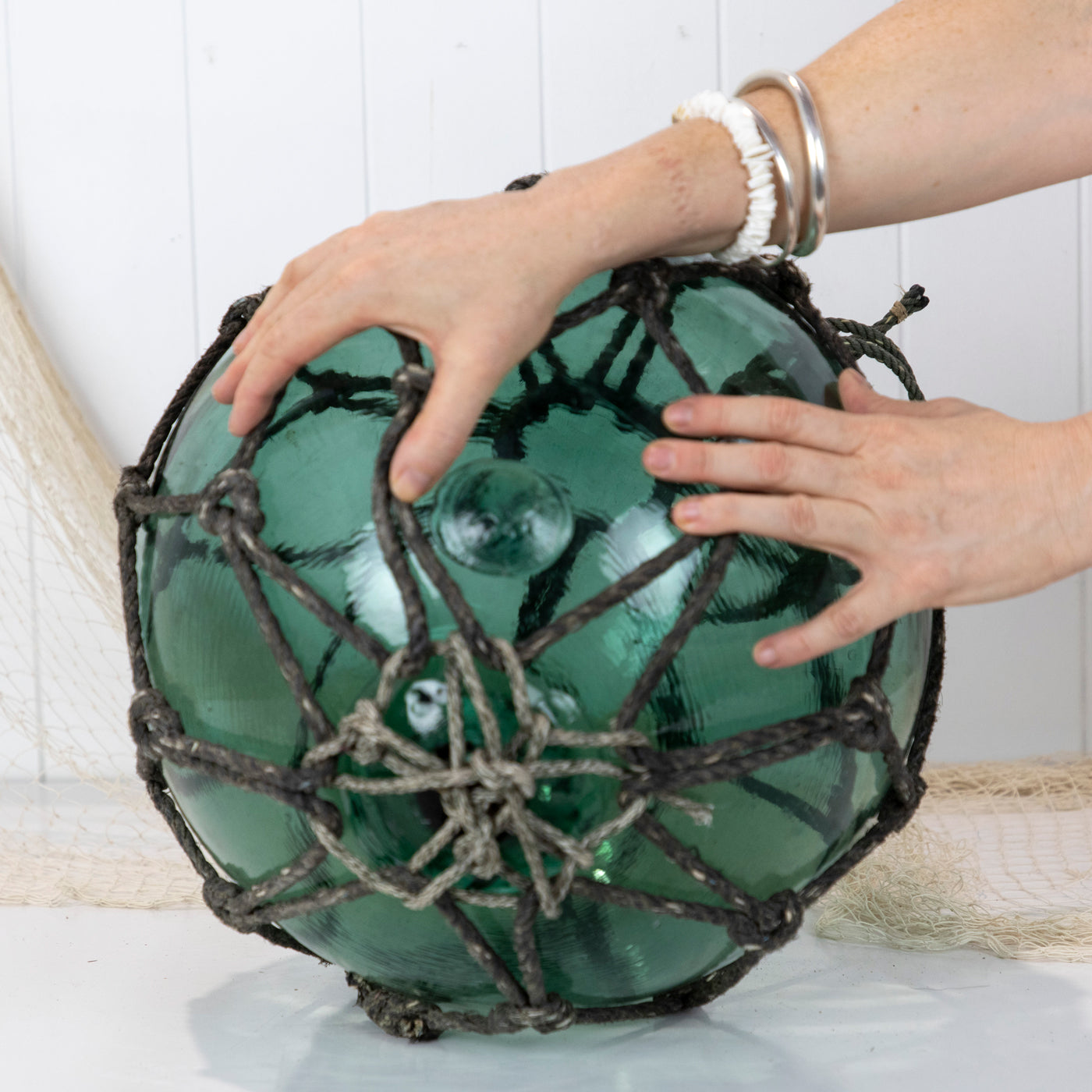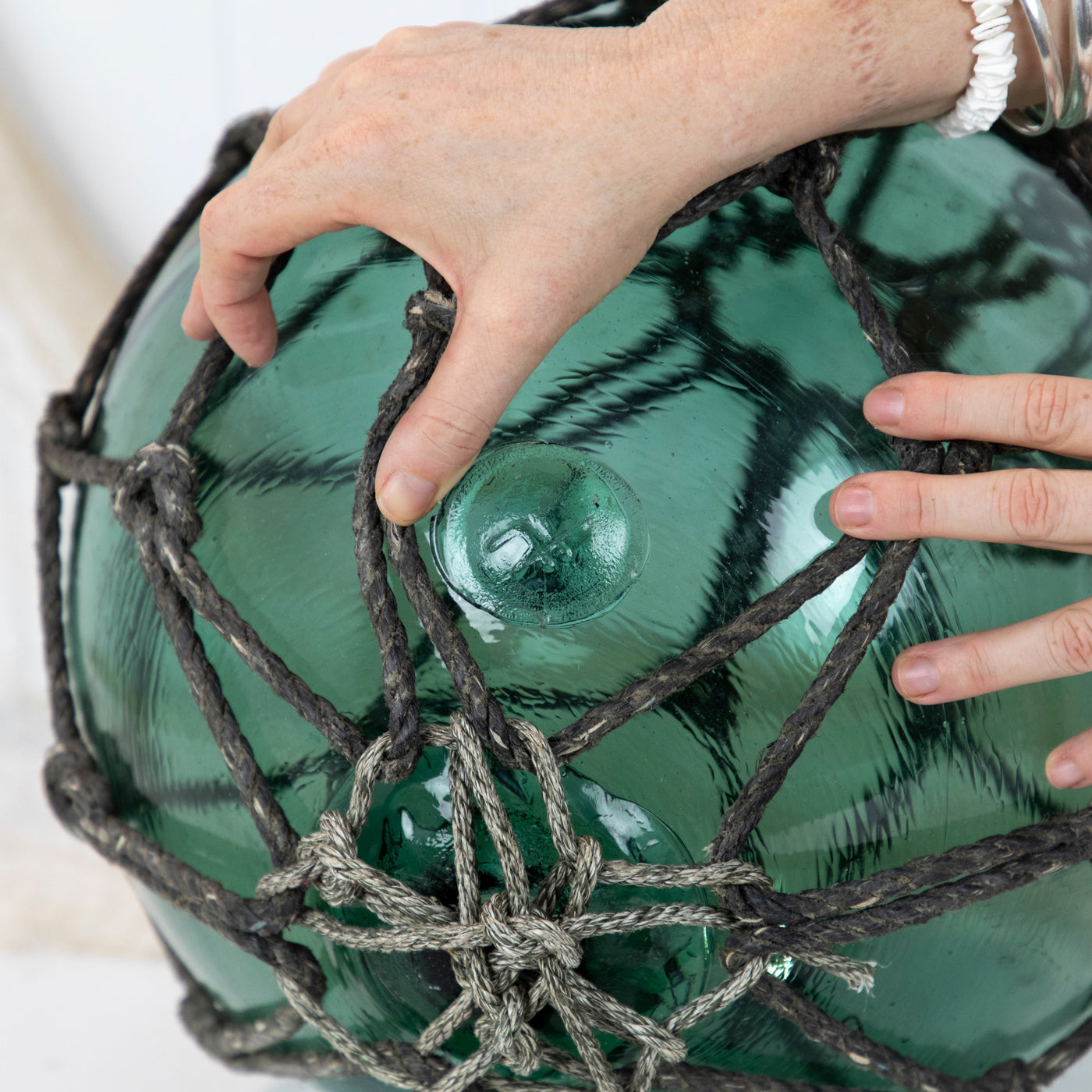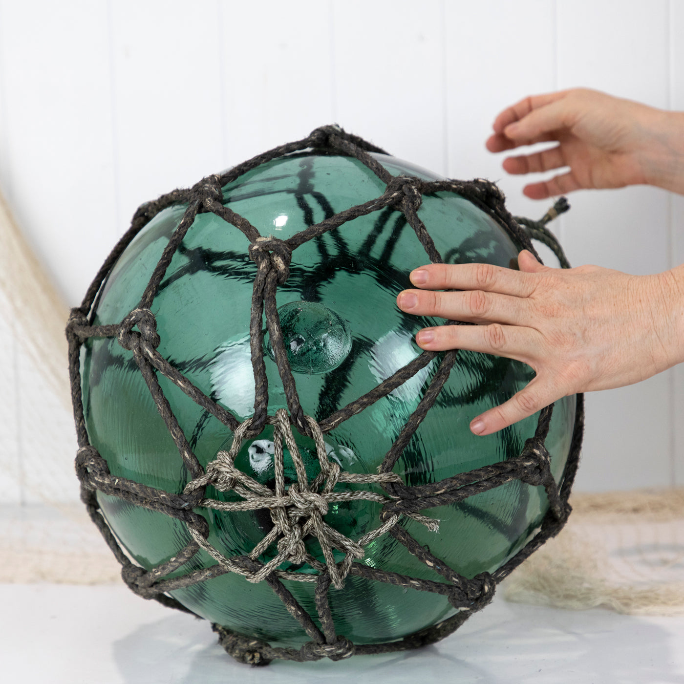 This beautiful old 14" Japanese longline glass float is a stunning colour with grey netting and a maker's mark.