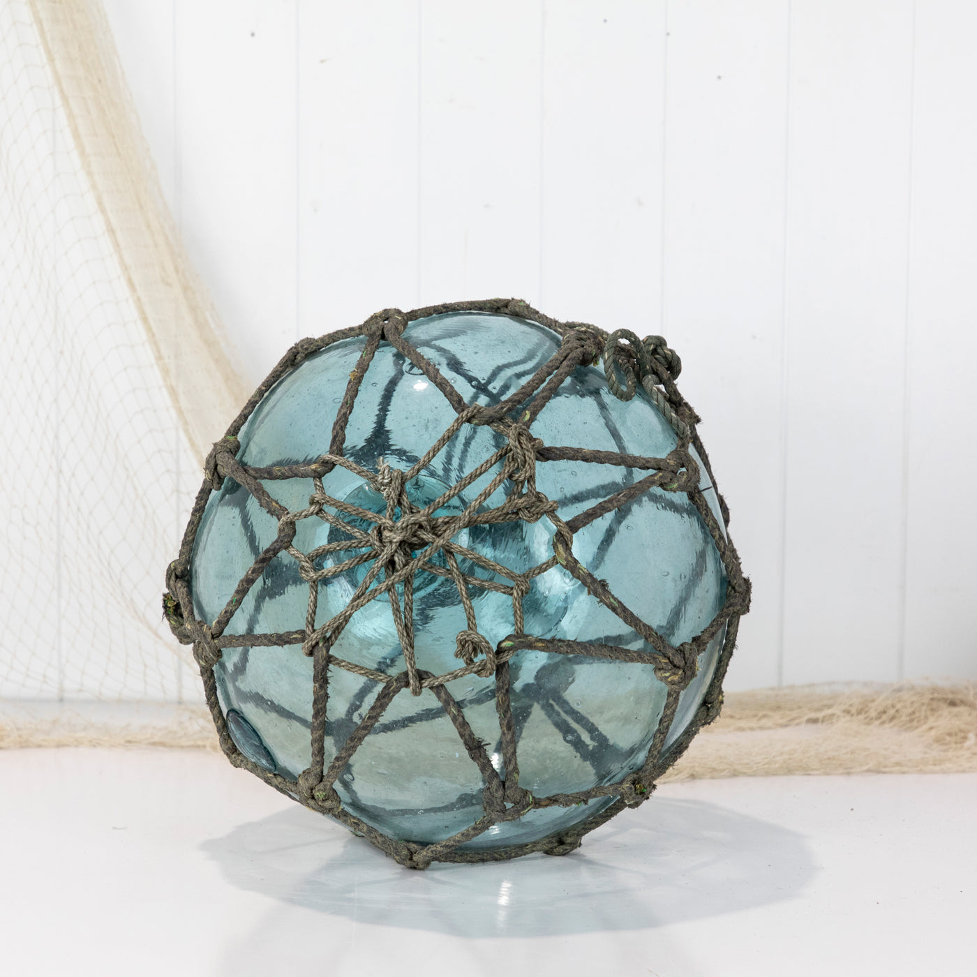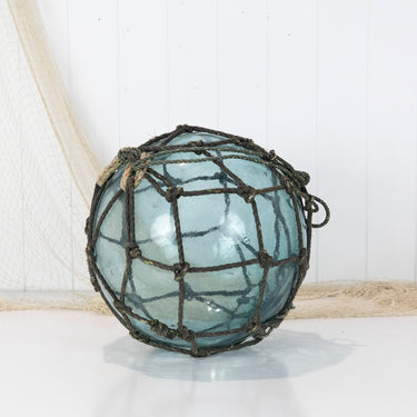 This beautiful old 14" Japanese longline glass float is a stunning colour with grey netting.