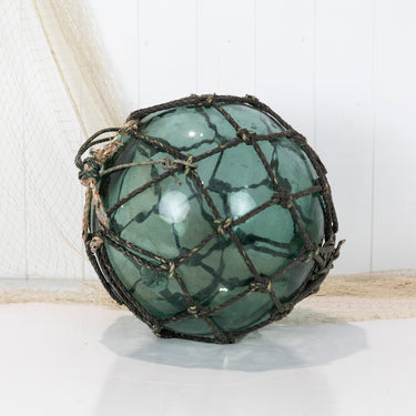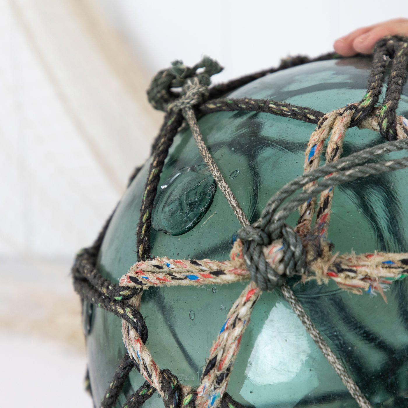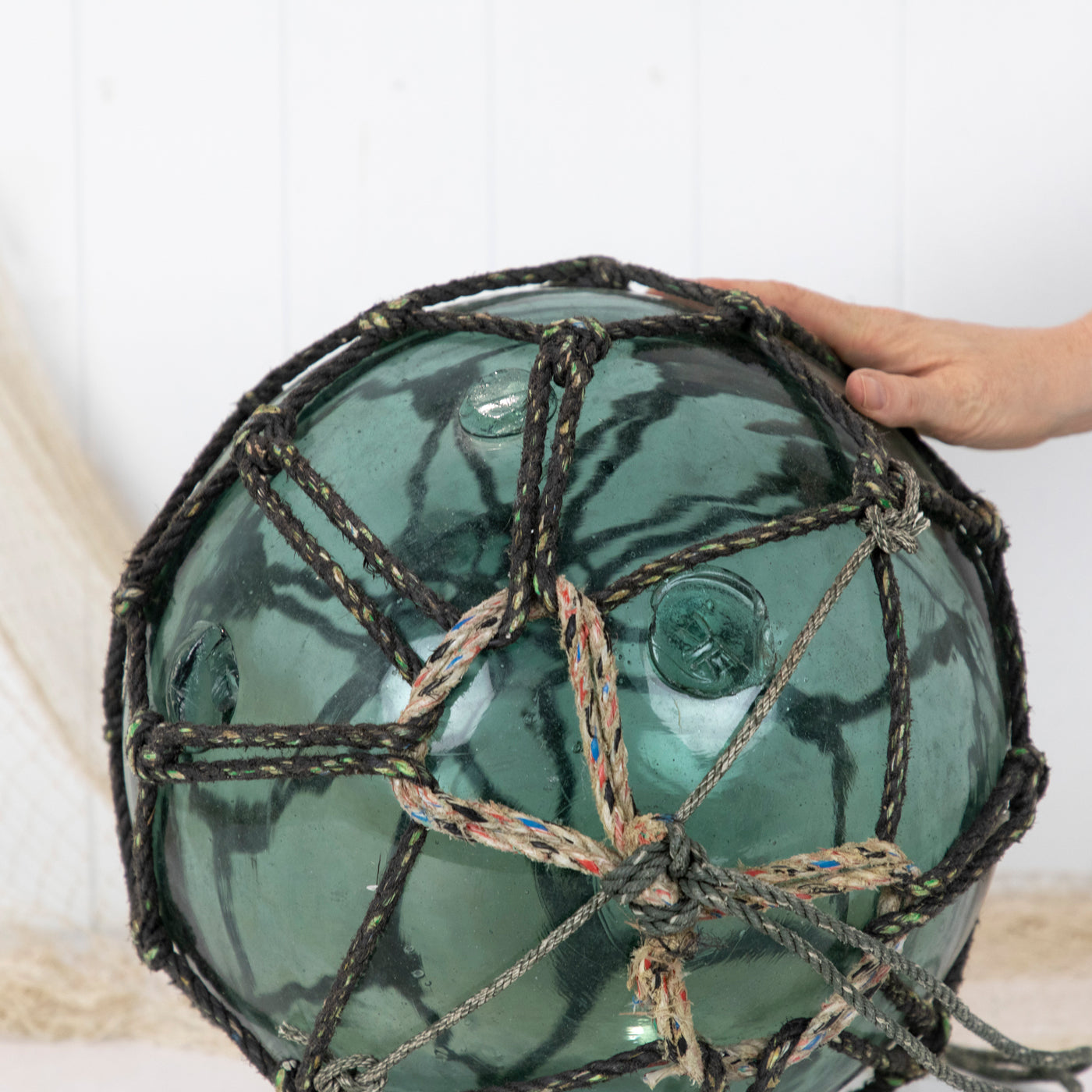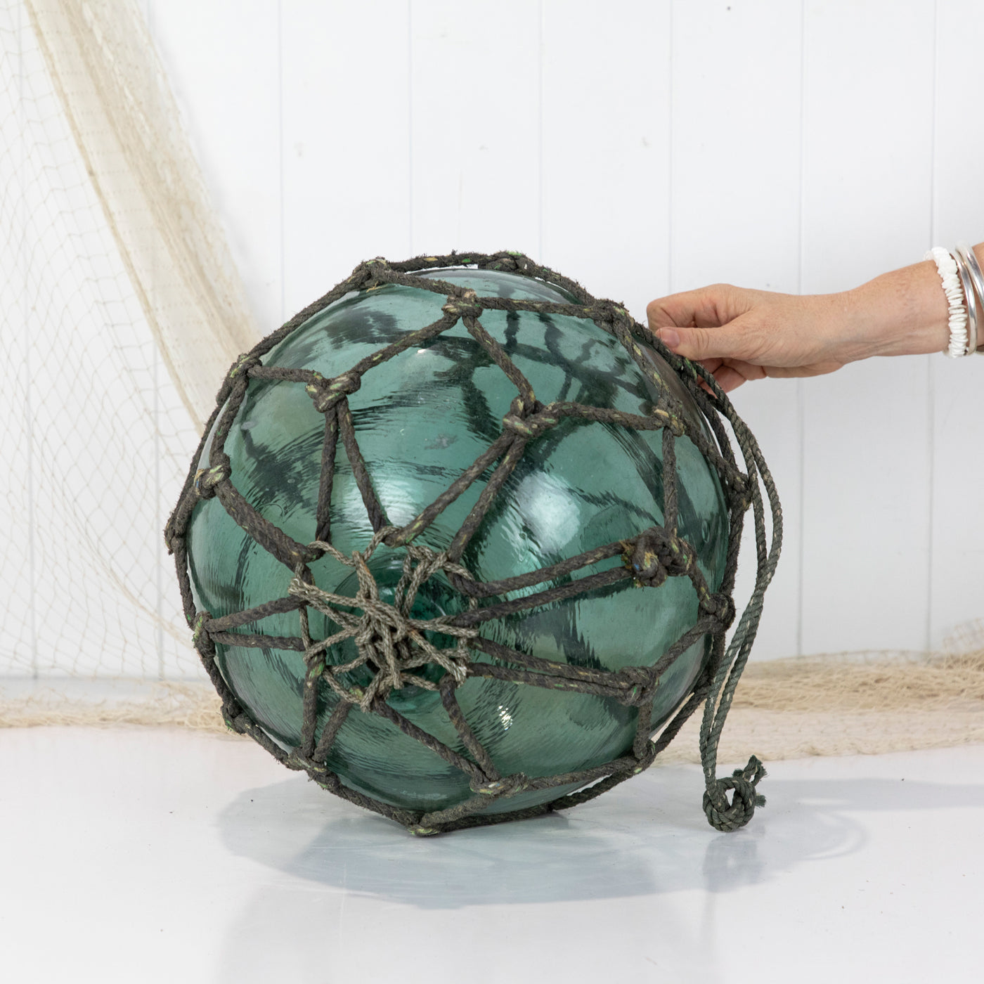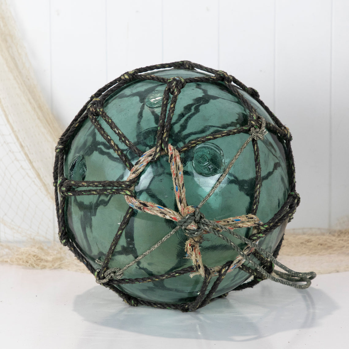 This beautiful old 14" Japanese longline glass float is a stunning colour with grey netting and a maker's mark.