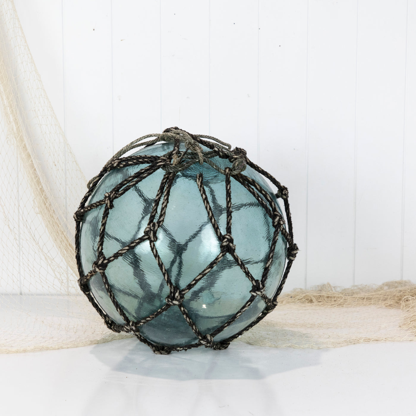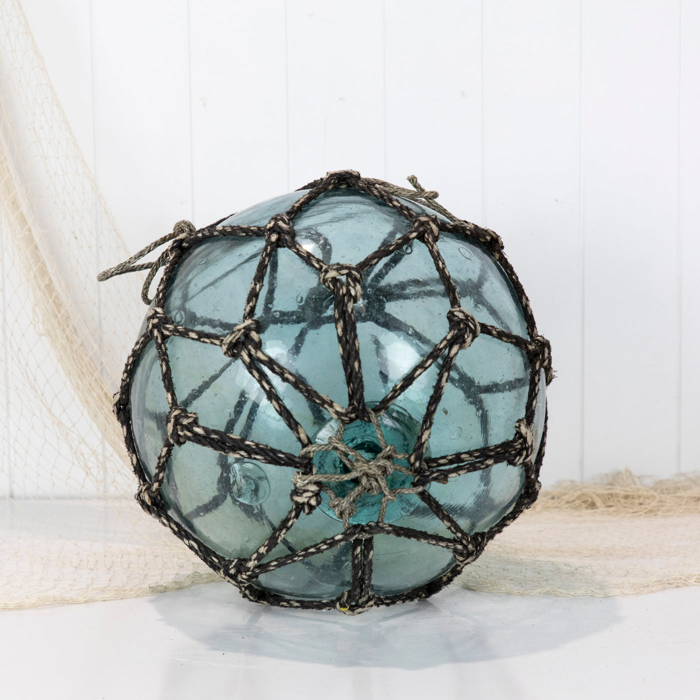 This beautiful old 14" Japanese longline glass float is a stunning colour with grey netting.