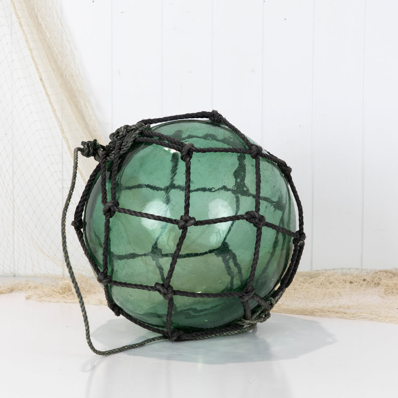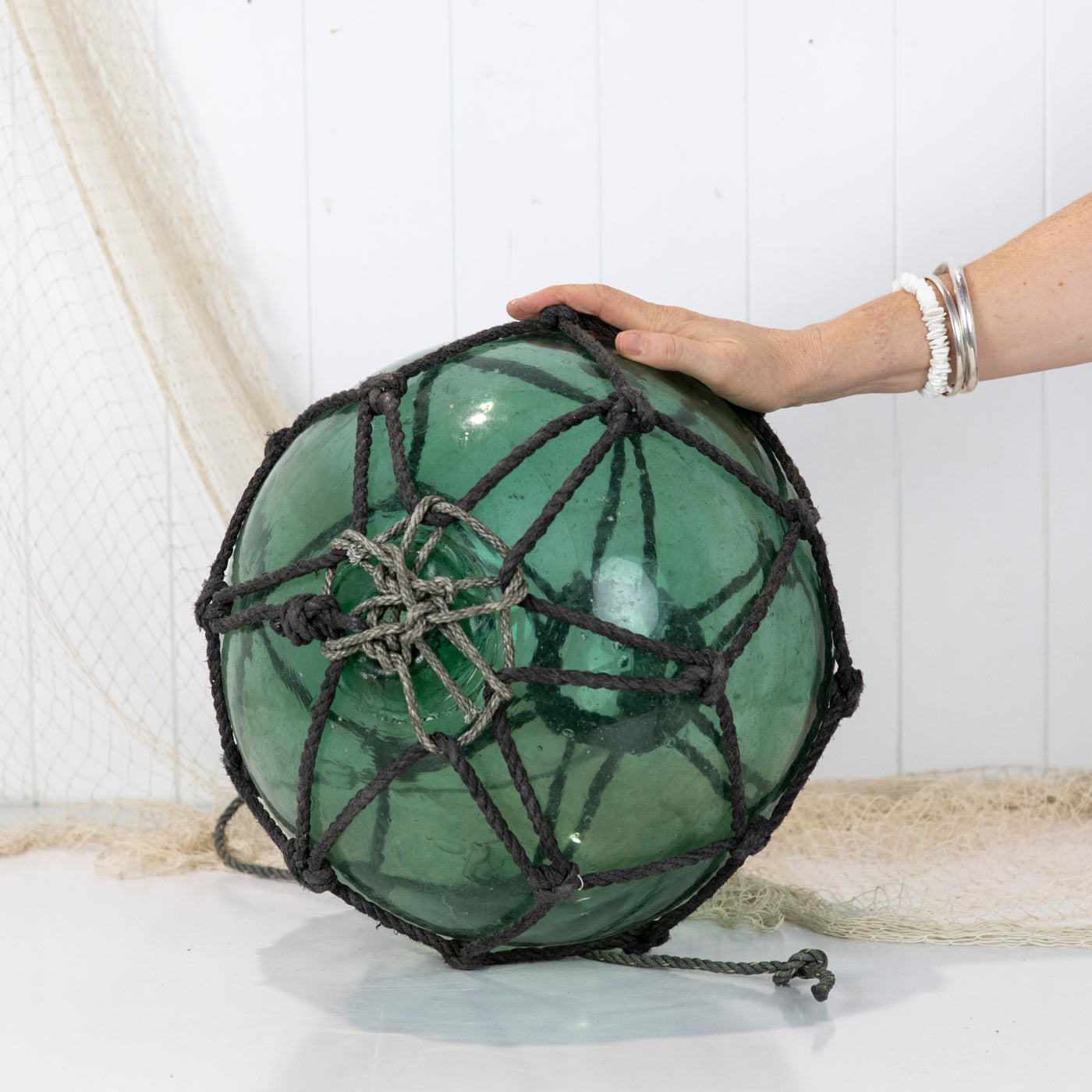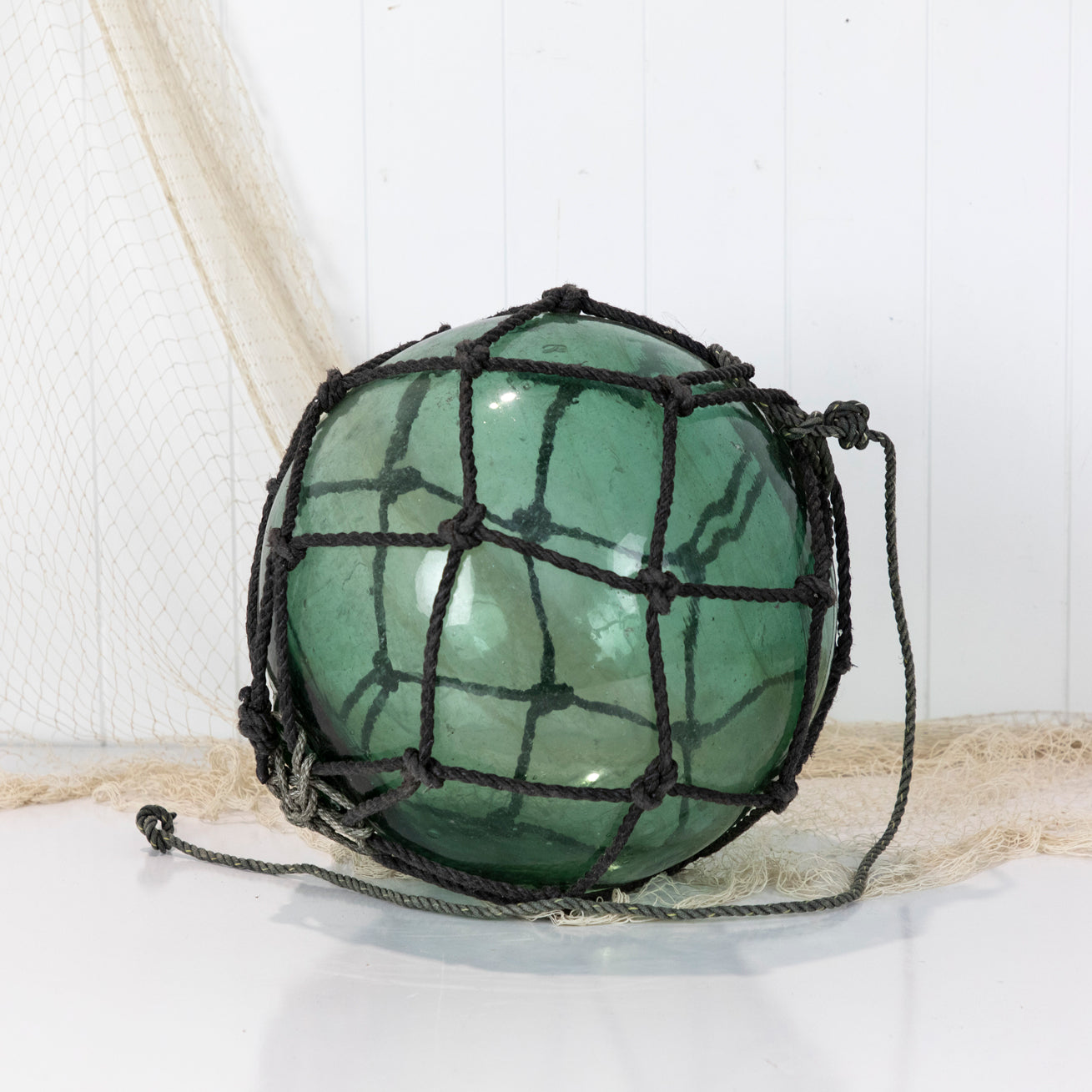 This beautiful old 14" Japanese longline glass float is a stunning colour with grey netting and a maker's mark.