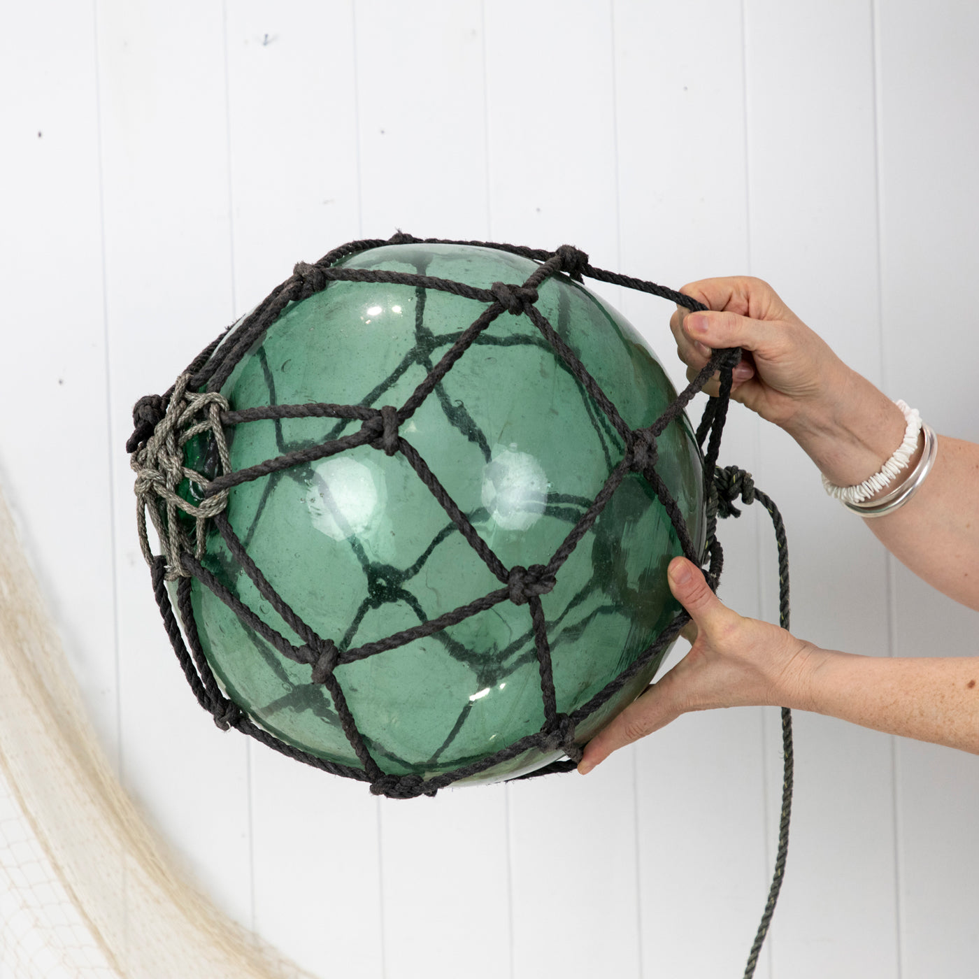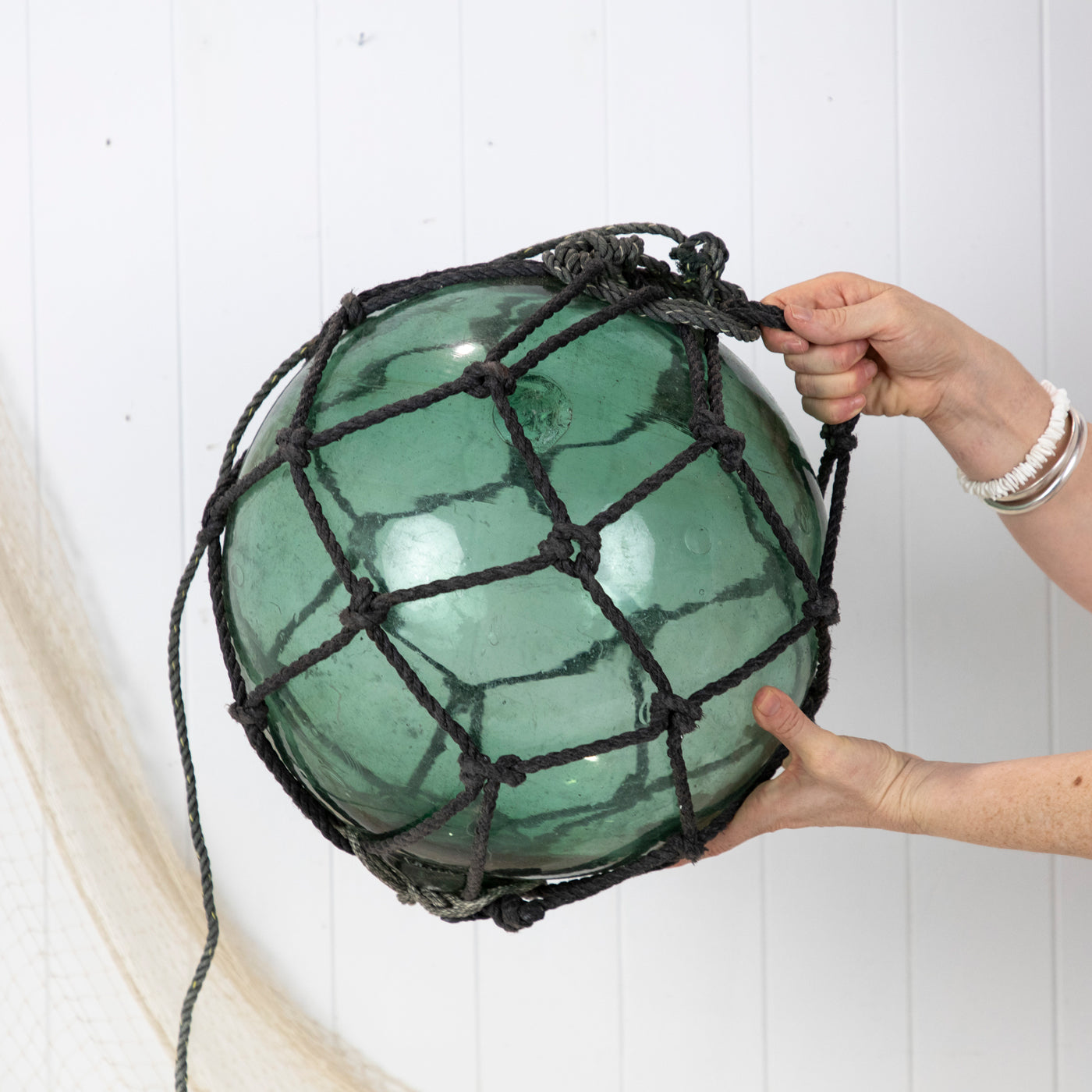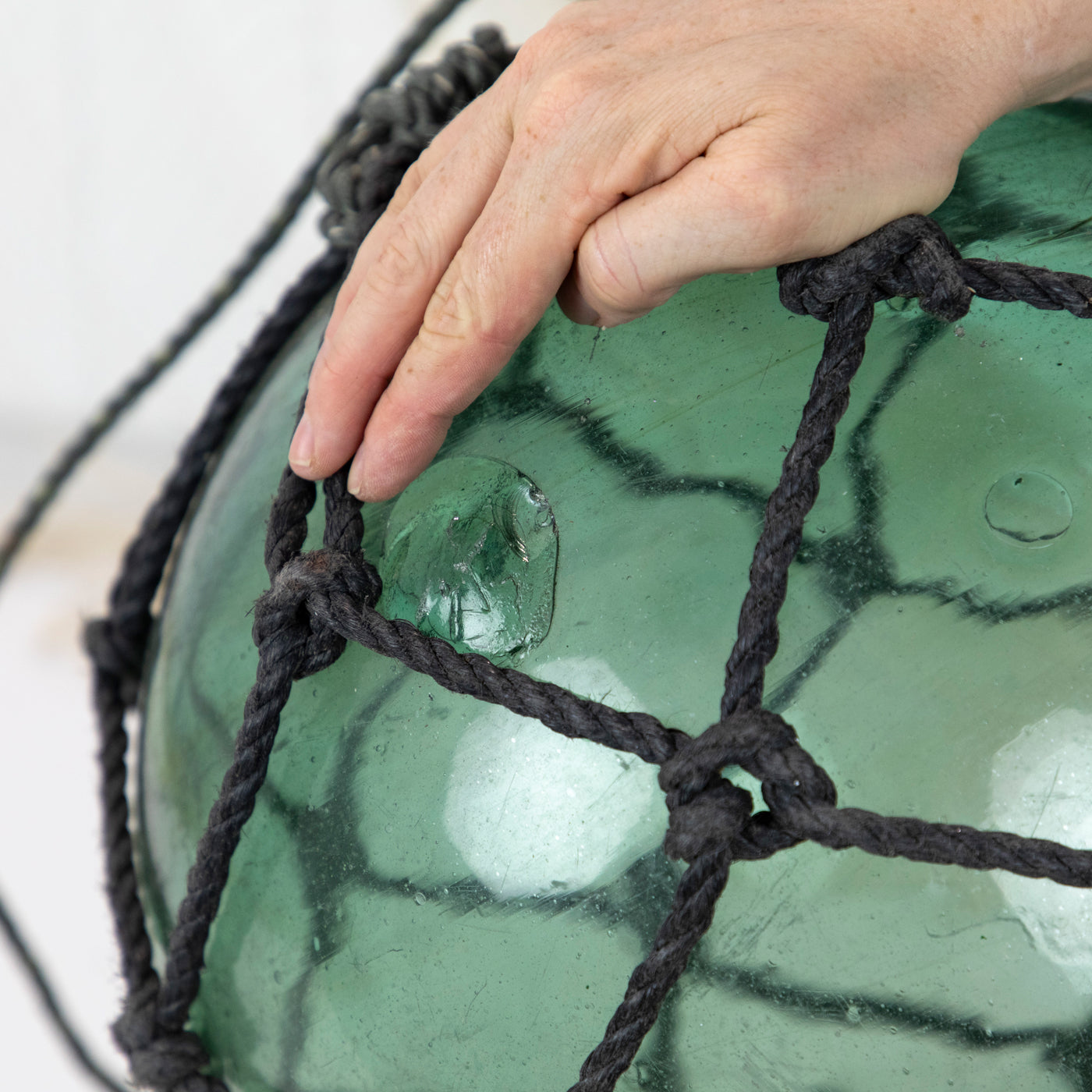 This beautiful old 14" Japanese longline glass float is a stunning colour with grey netting and a maker's mark.