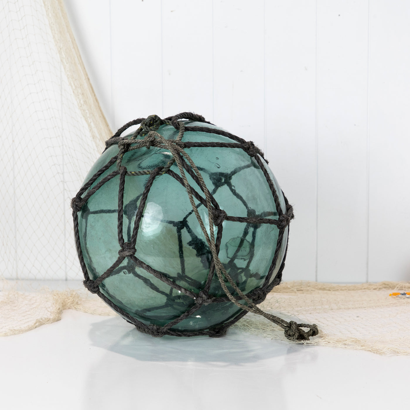 This beautiful old 14" Japanese longline glass float is a stunning colour with grey netting and a maker's mark.
