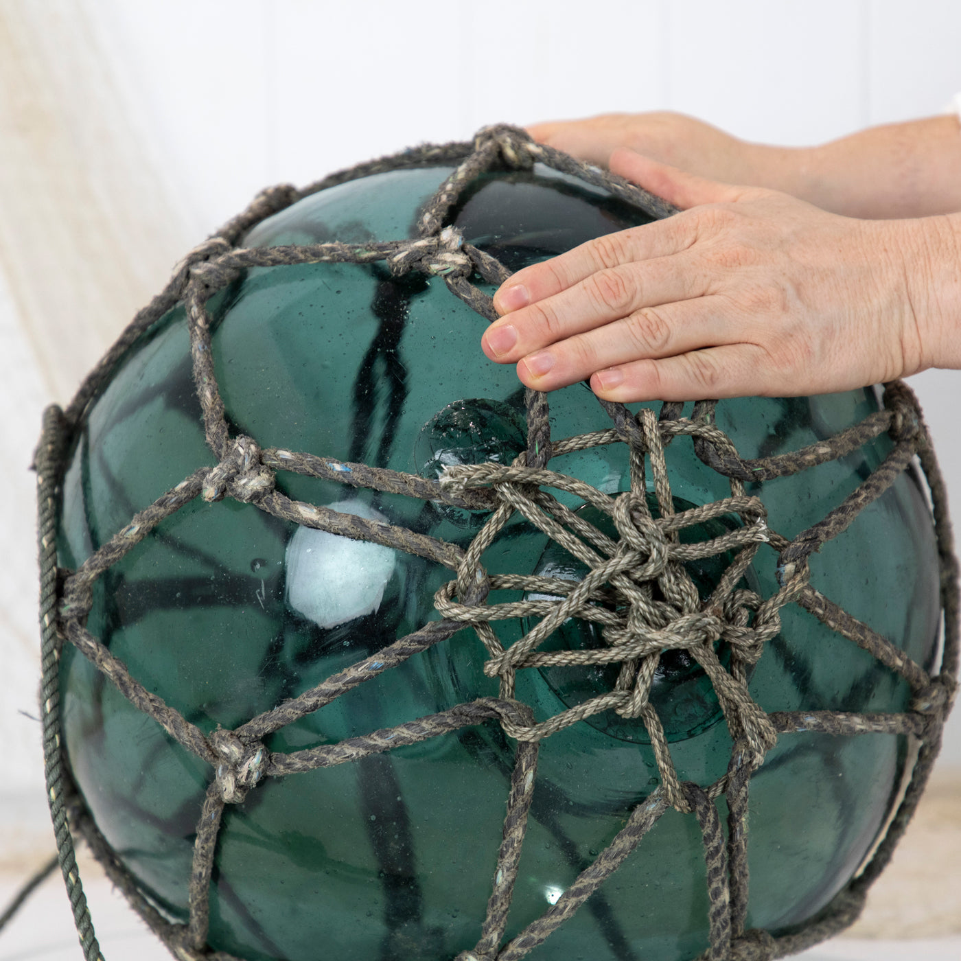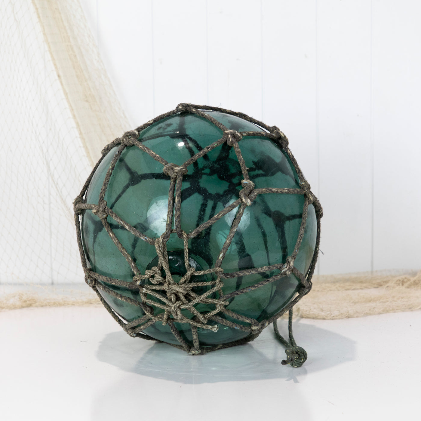 This beautiful old 14" Japanese longline glass float is a stunning colour with grey netting and a maker's mark.