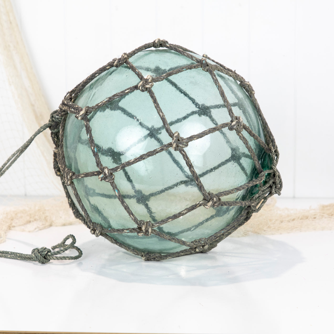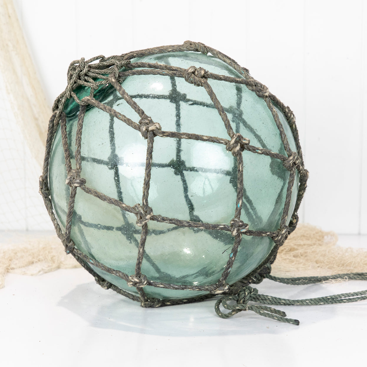 This beautiful old 14" Japanese longline glass float is a stunning colour with grey netting.