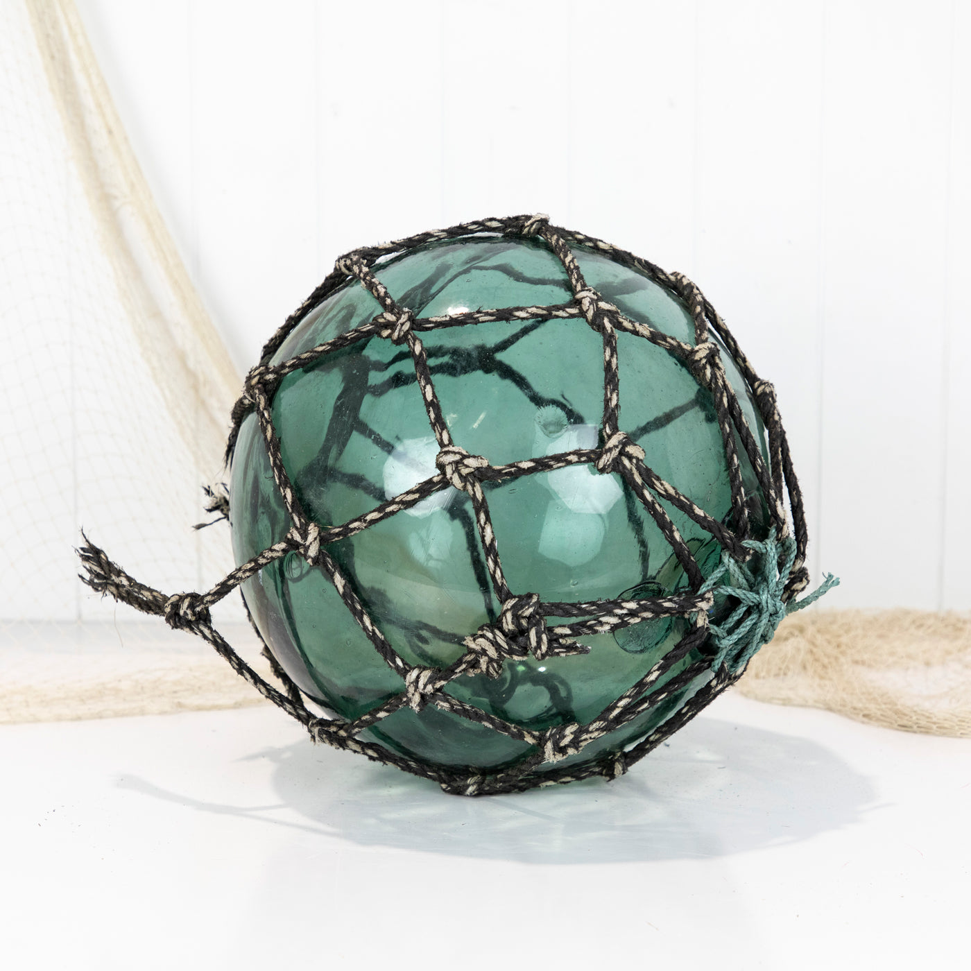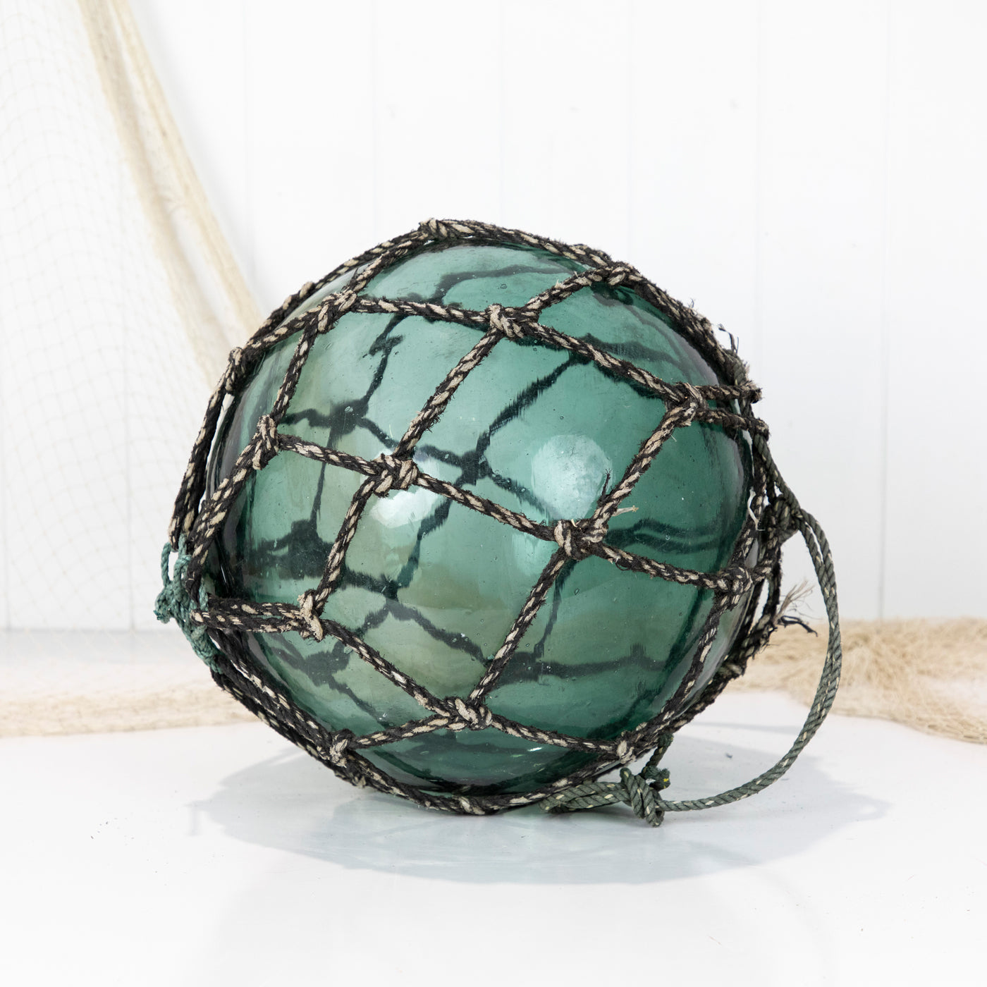 This beautiful old 14" Japanese longline glass float is a stunning colour with grey netting and a maker's mark.