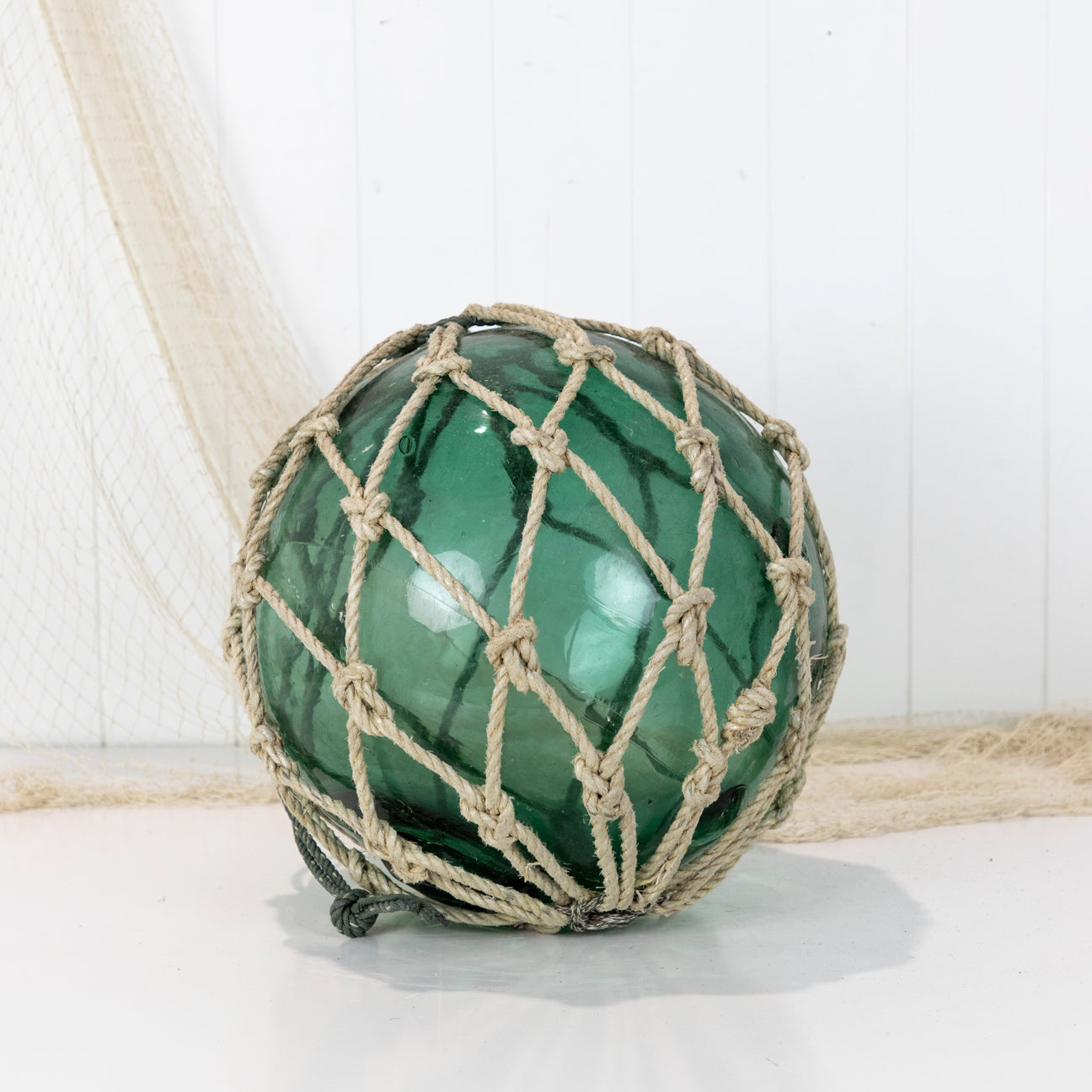 This beautiful old 14" Japanese longline glass float is a stunning colour with beige netting and a maker's mark.