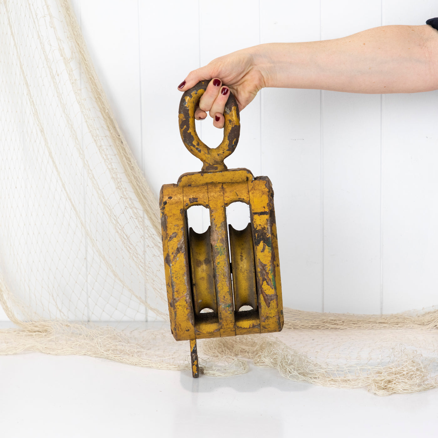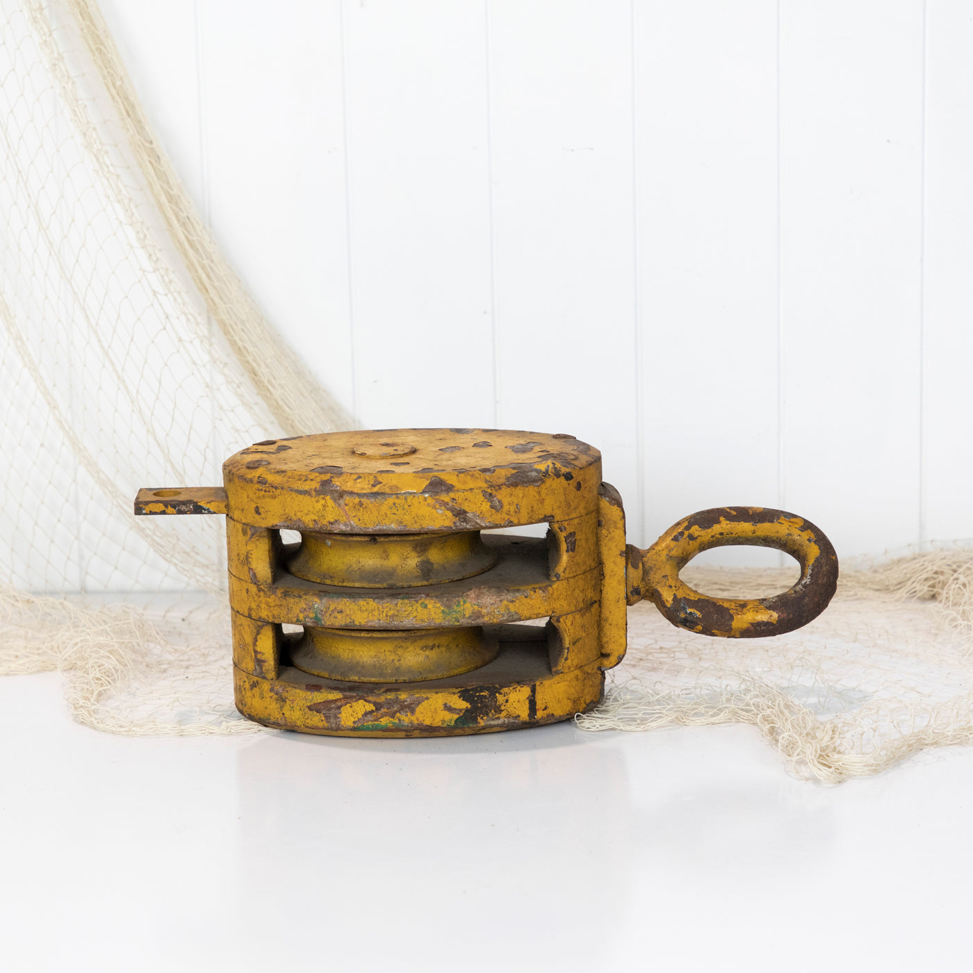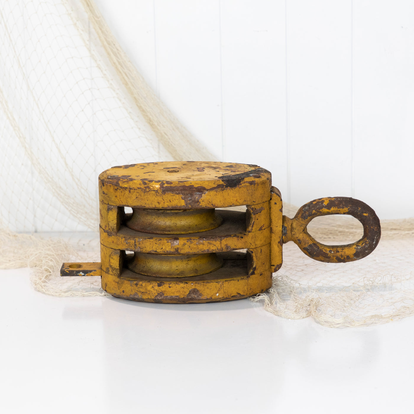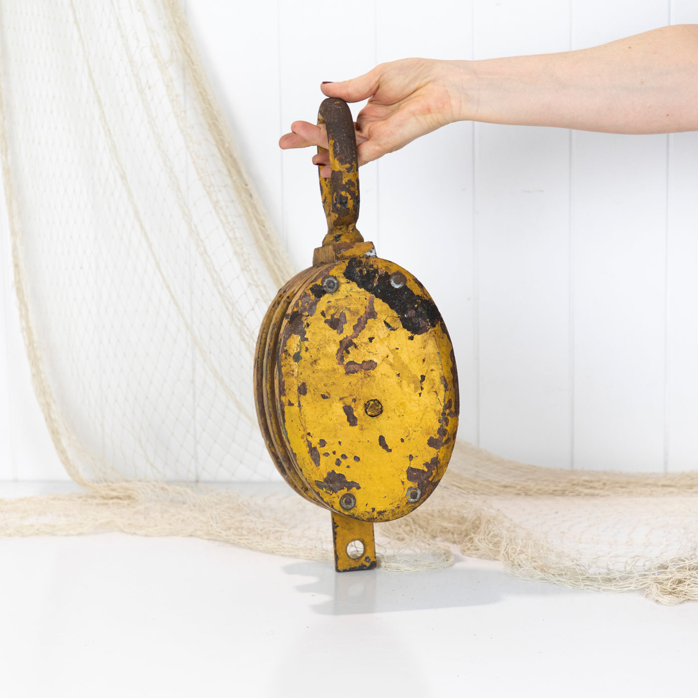 This big old wooden pulley has been given a coat of mustard yellow paint.