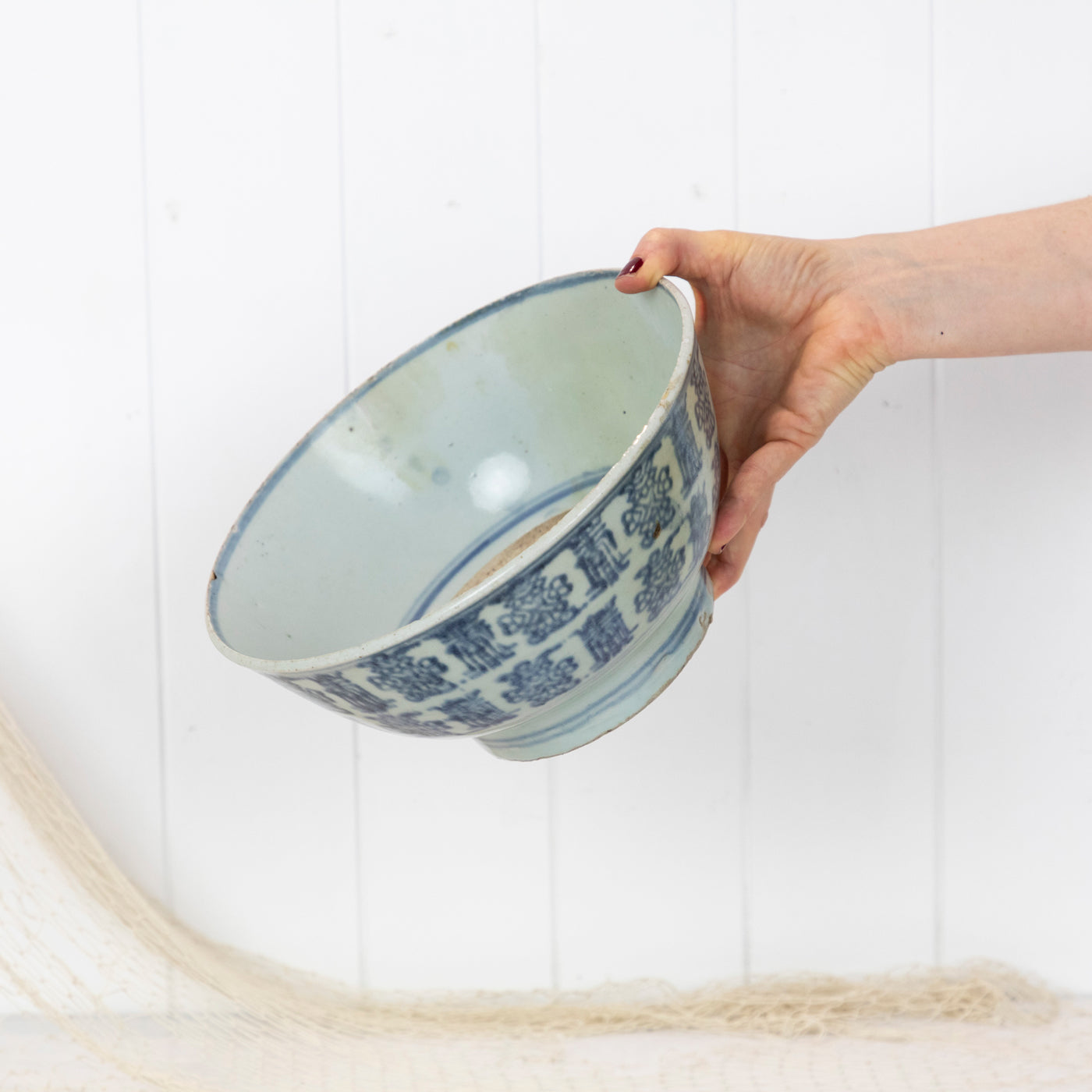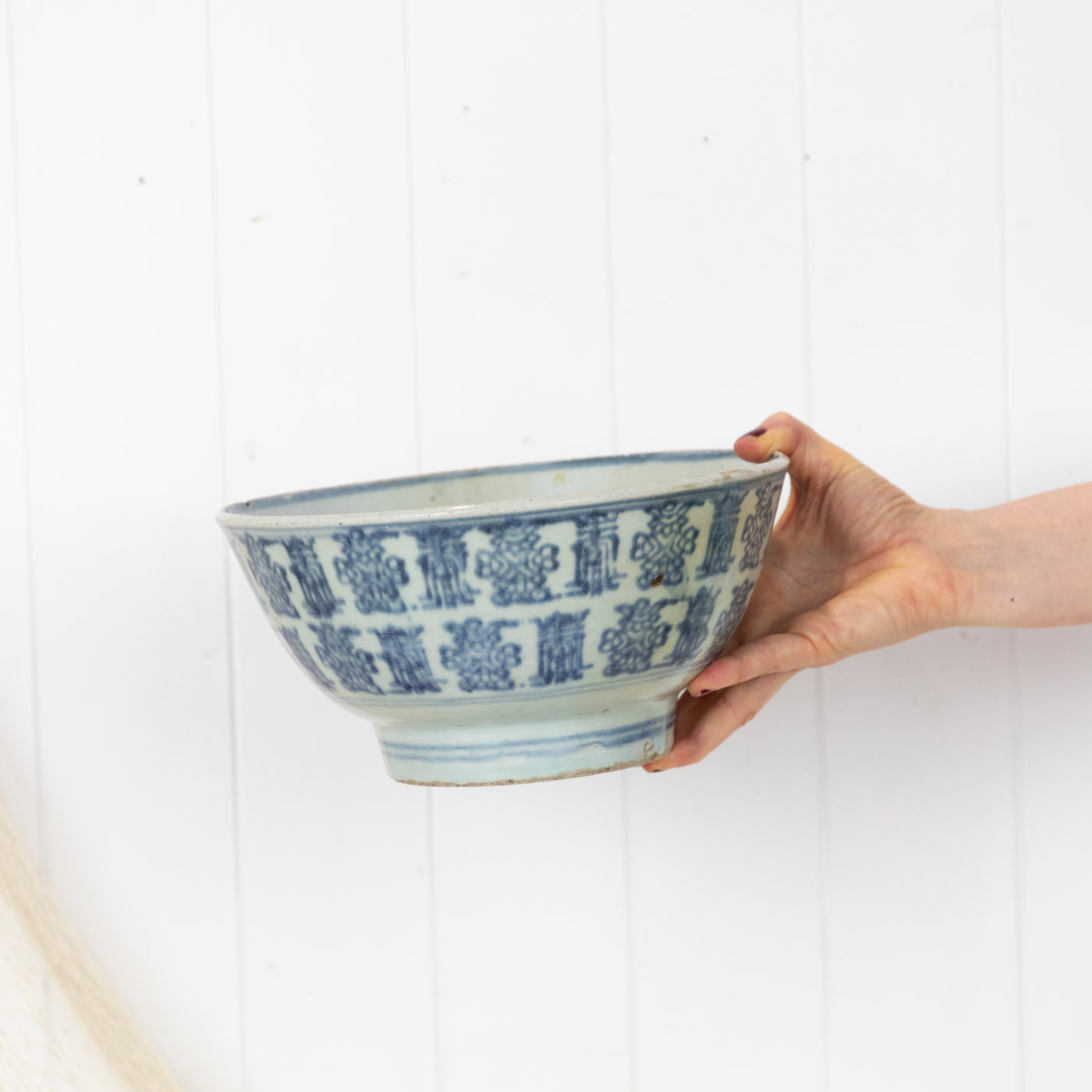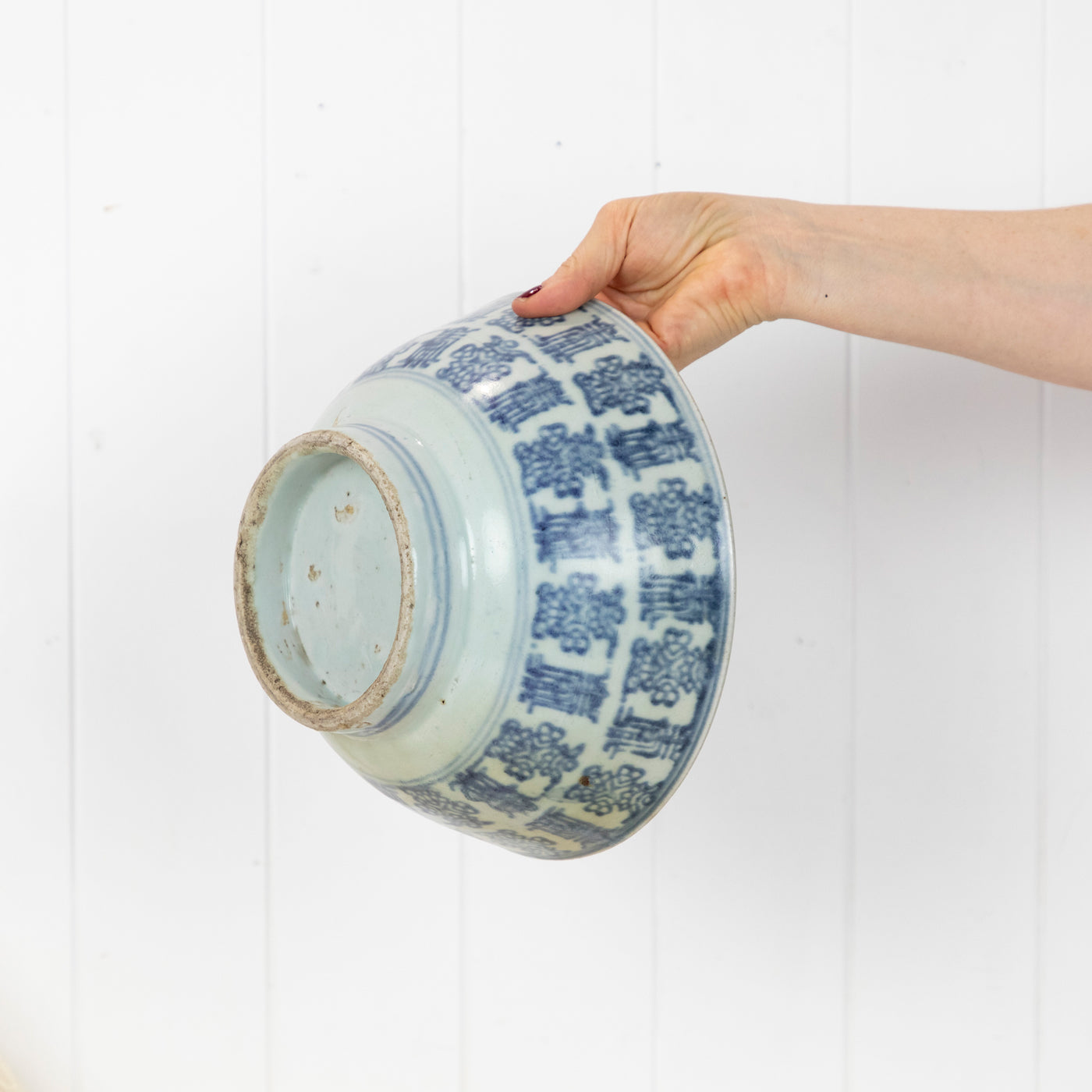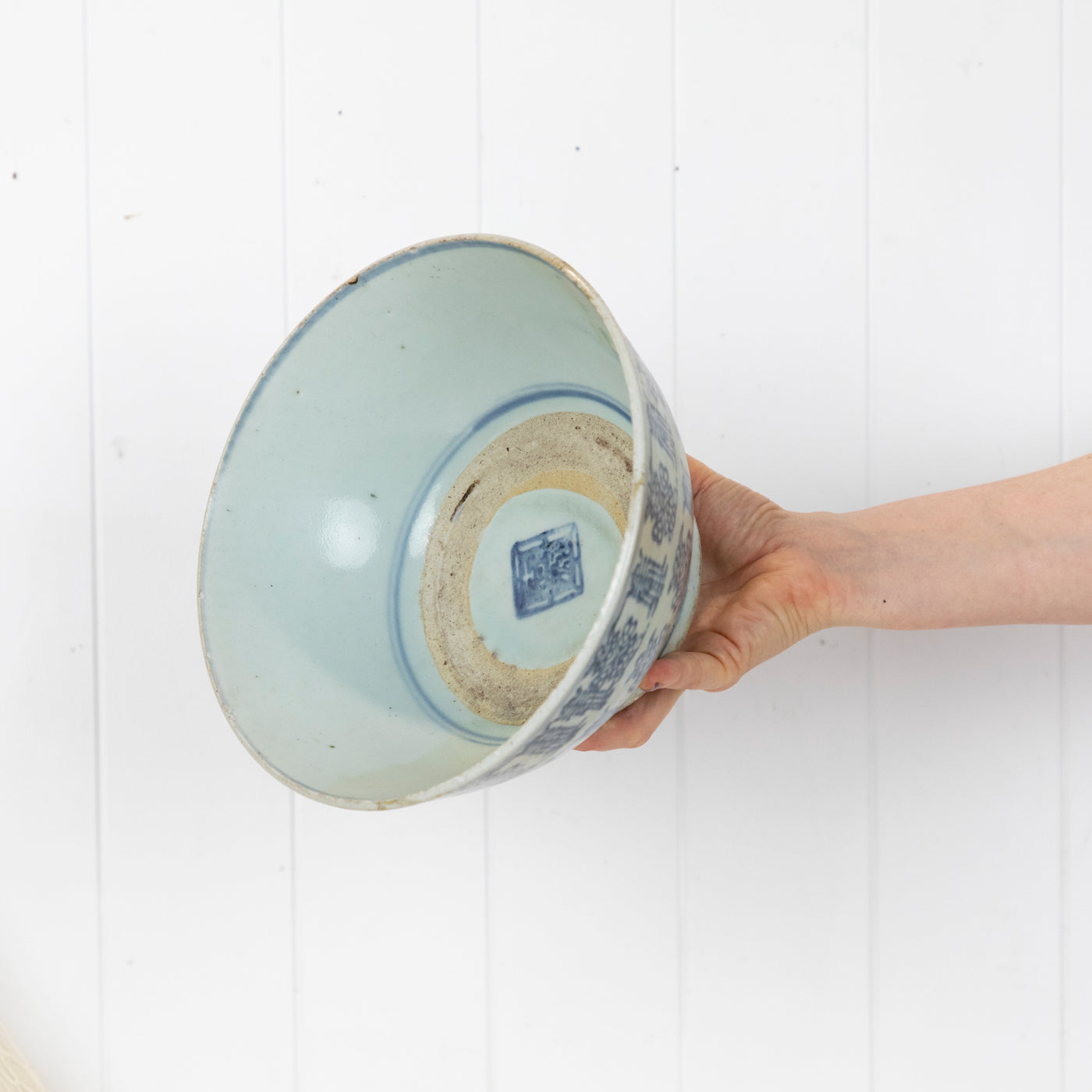 The bowl is a soft blue with a darker blue painted design. Some pitting and crazing can be seen as you would expect with a piece of this age.