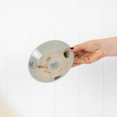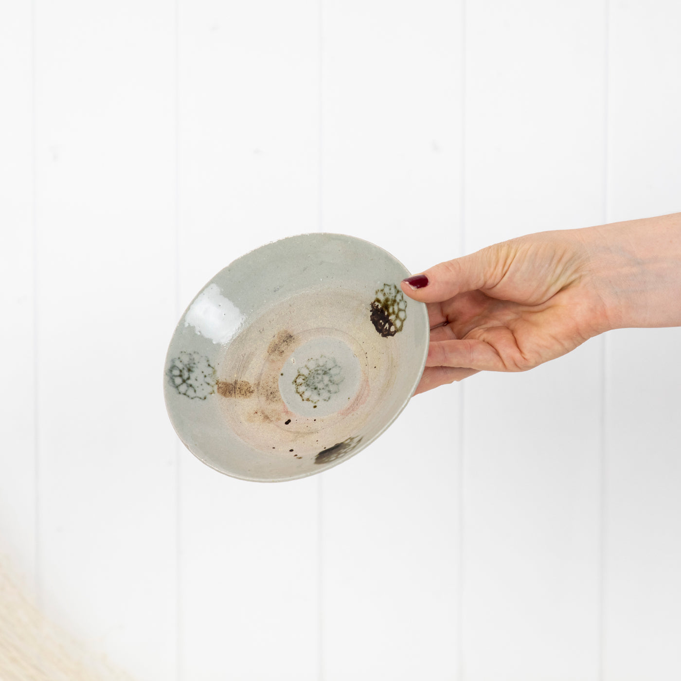 The dish is a soft blue/grey with a darker blue painted design. Some pitting and crazing can be seen as you would expect with a piece of this age.