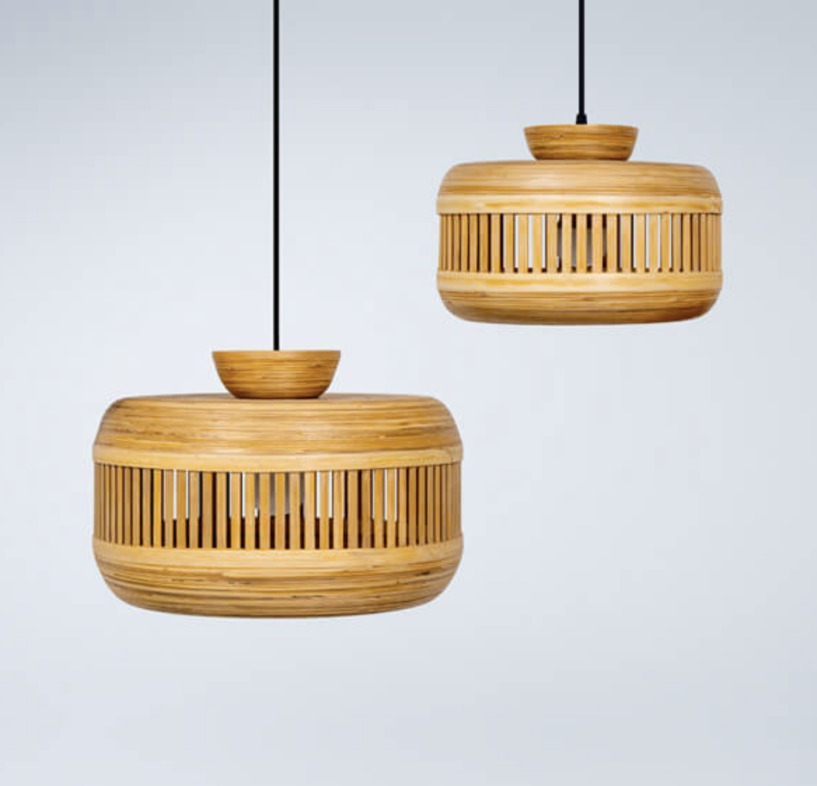 These lightshades have been made from spun bamboo that is then lacquered.