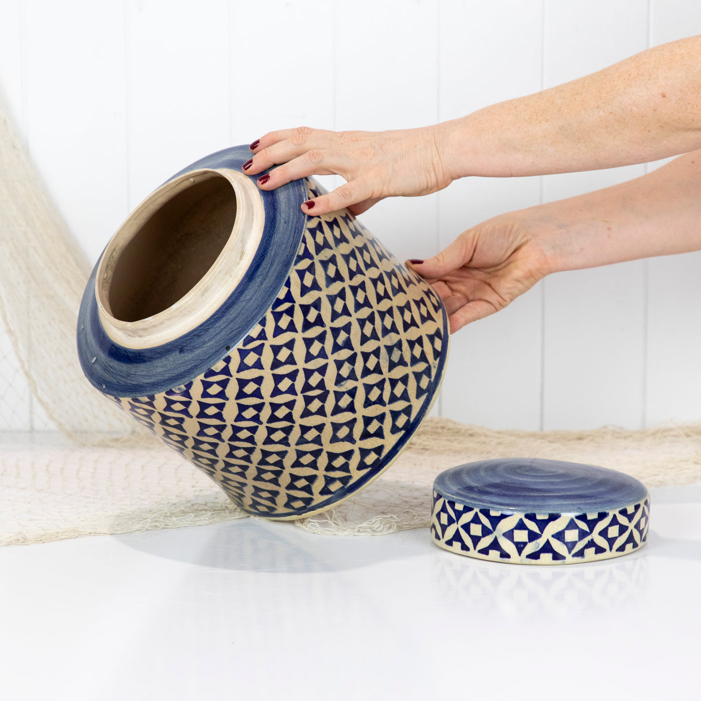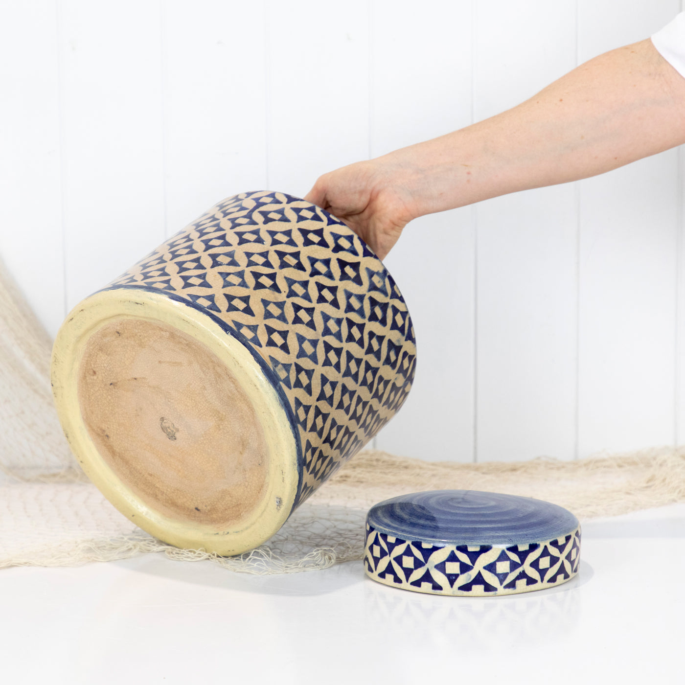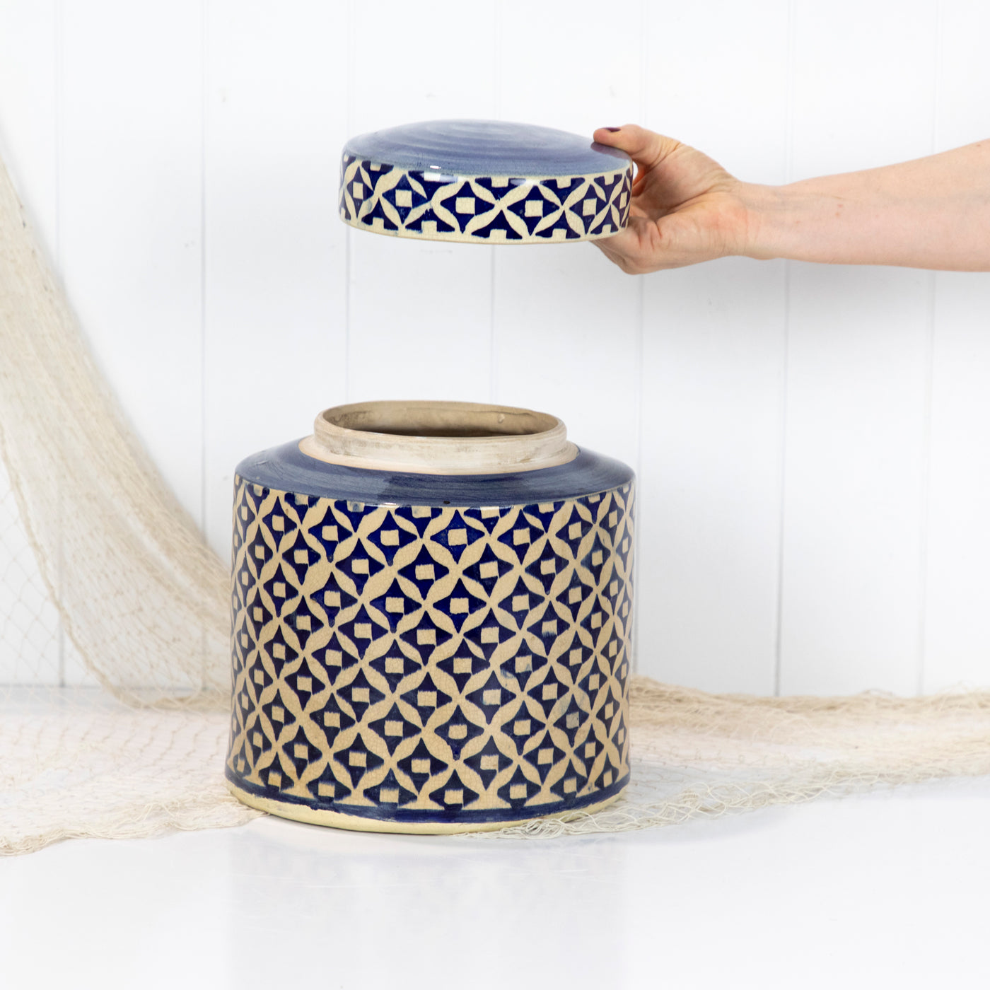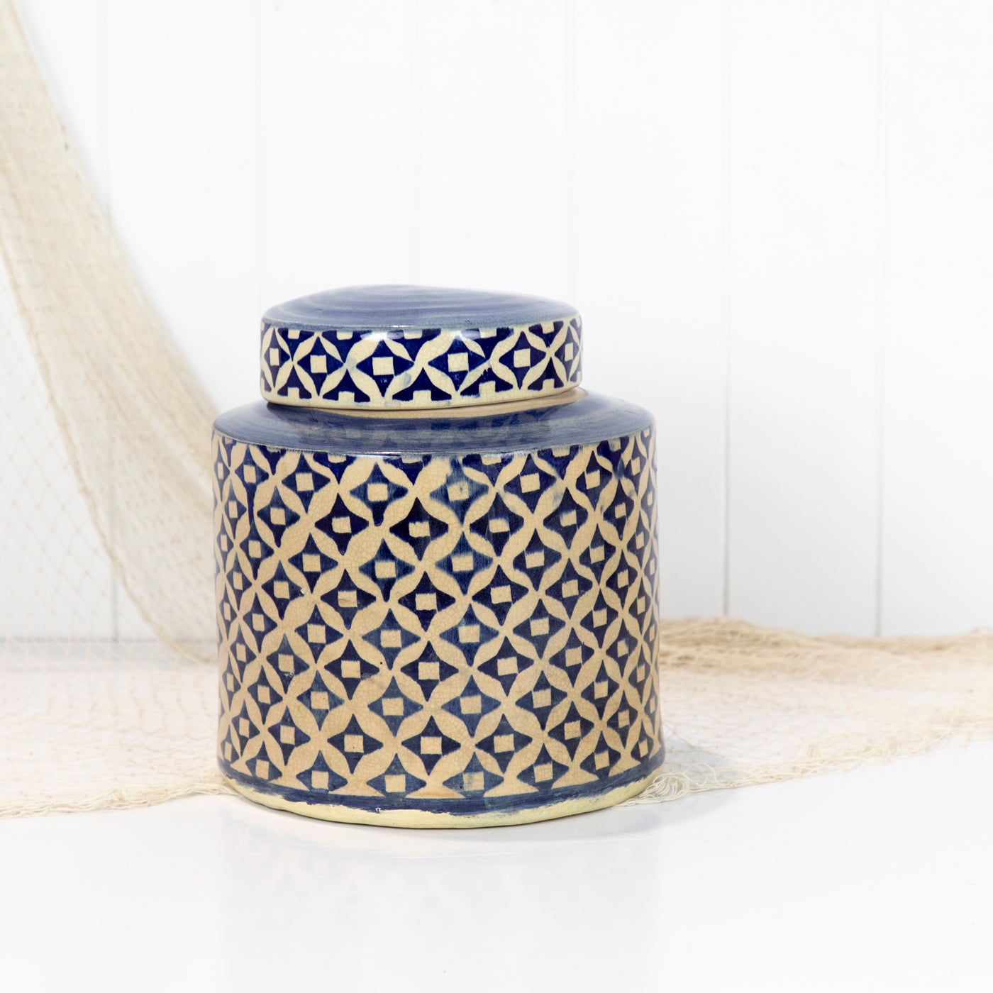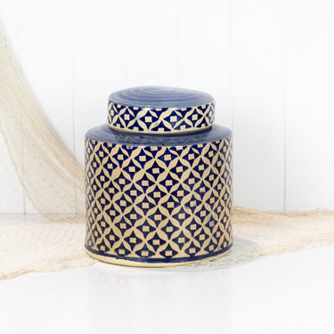 This ceramic jar with a lid has a classic blue and white pattern.