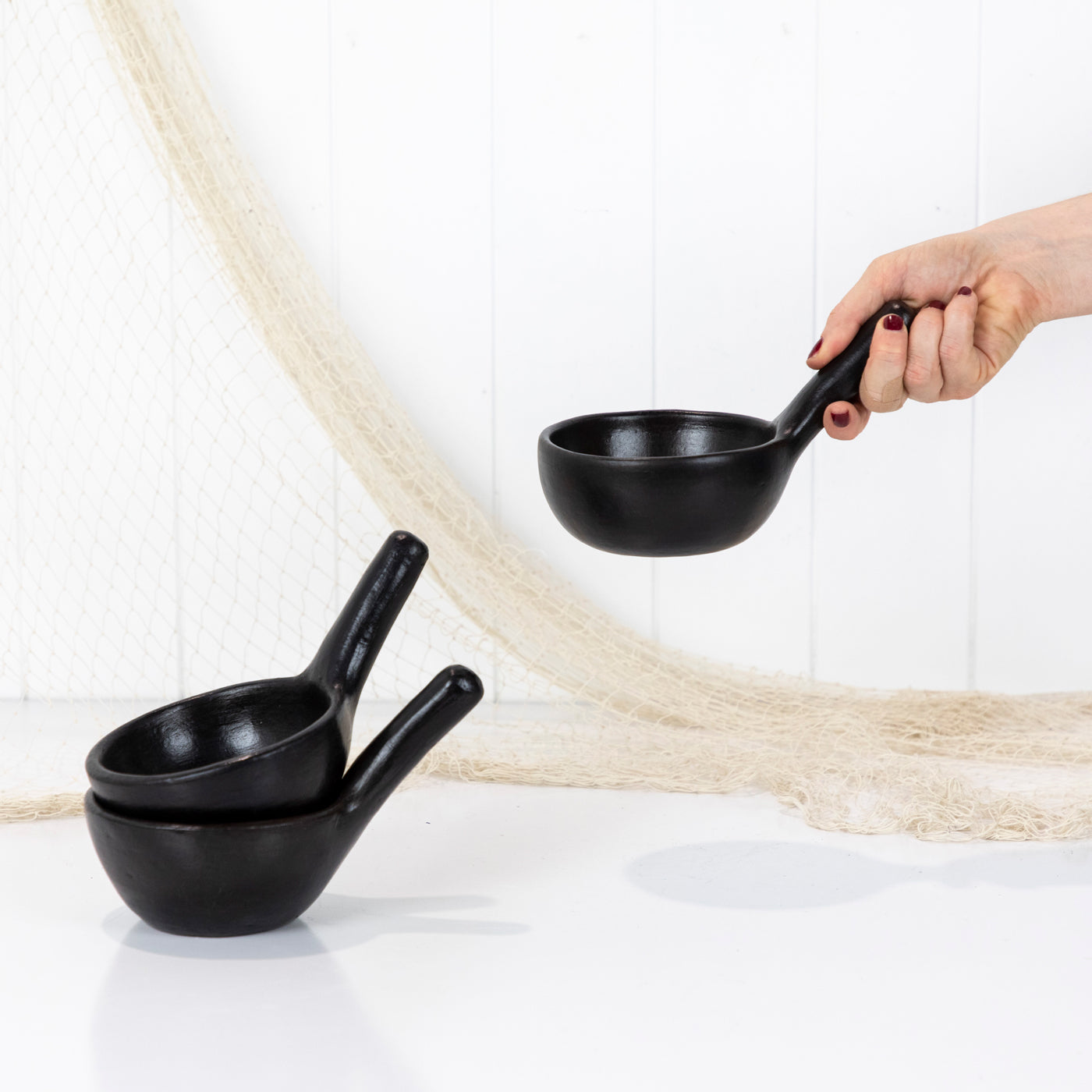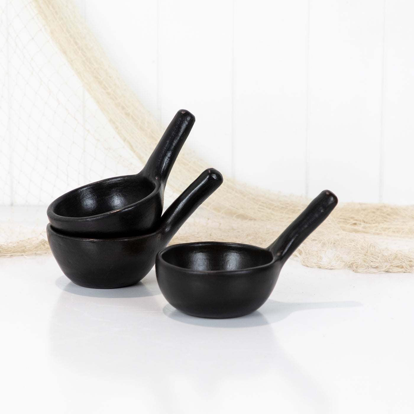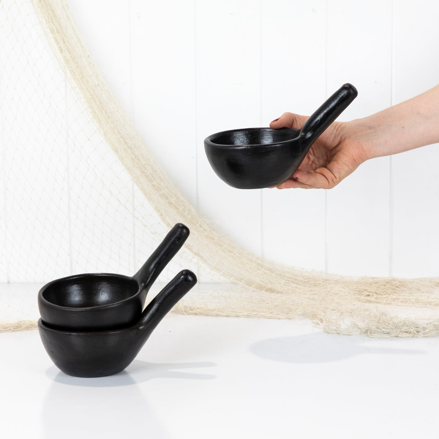 This sweet bowls are made from clay and painted black.