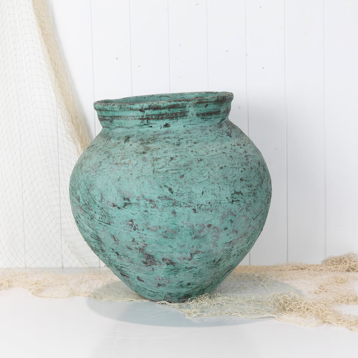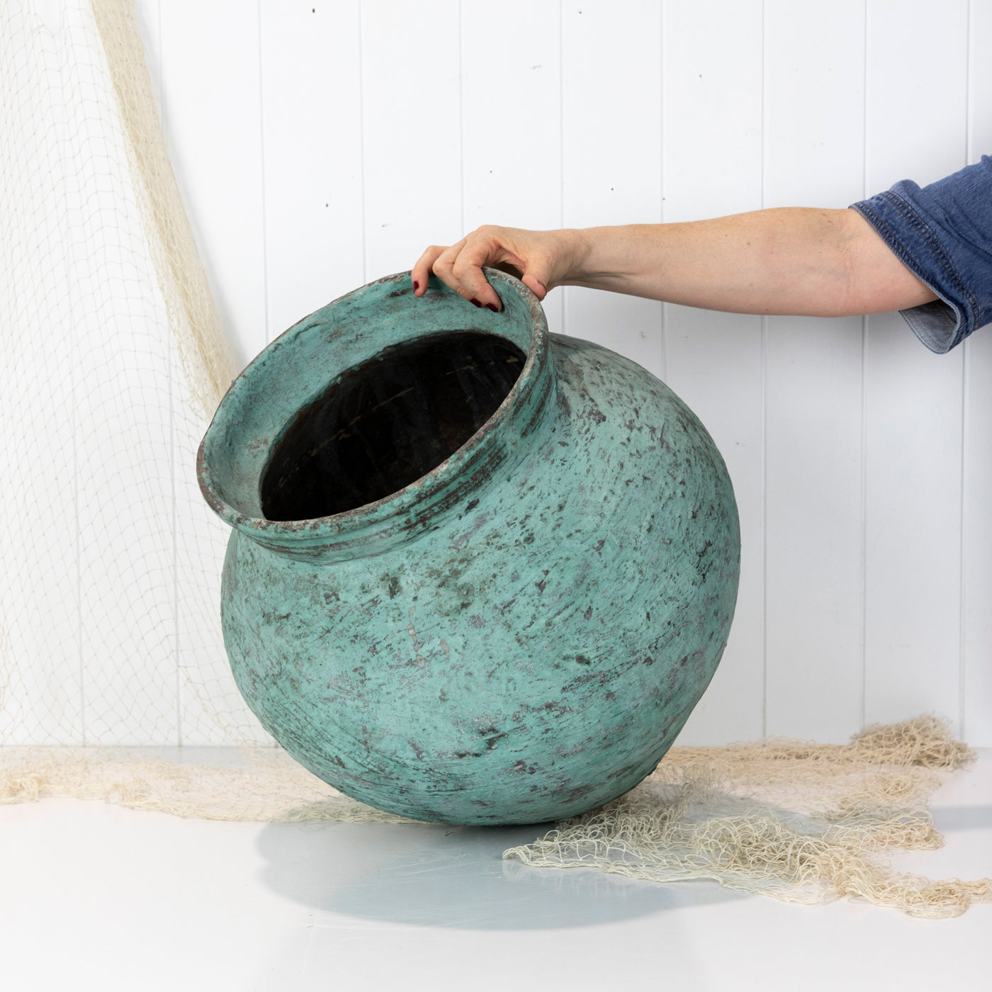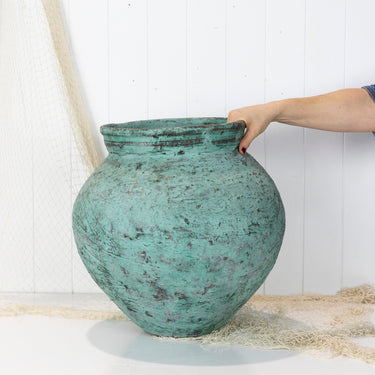 This pot was a fabulous find! Found in the back streets in Indonesia, this pot has the most beautiful green colour and texture. It would look fabulous with a potted palm or fiddle leaf. A stunning piece.