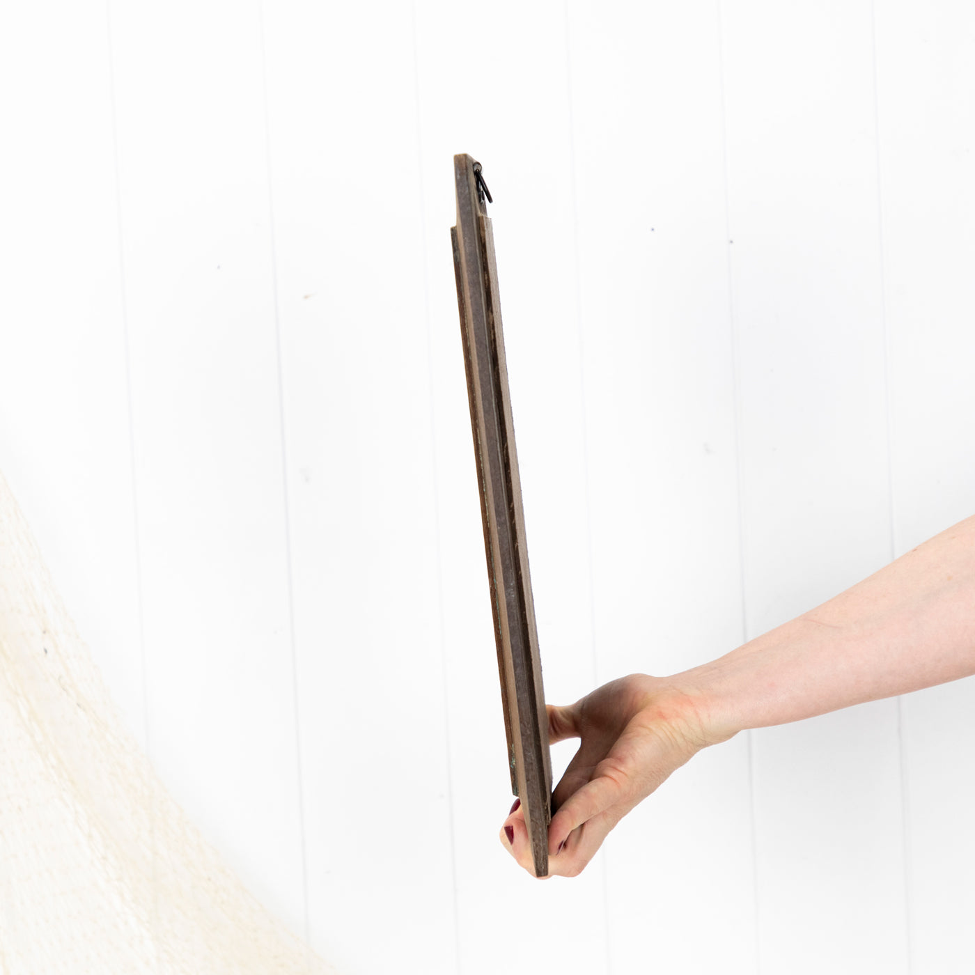 The timber is beautifully aged, with some remnants of past paint colours. Fitted with a hook ready to hang.