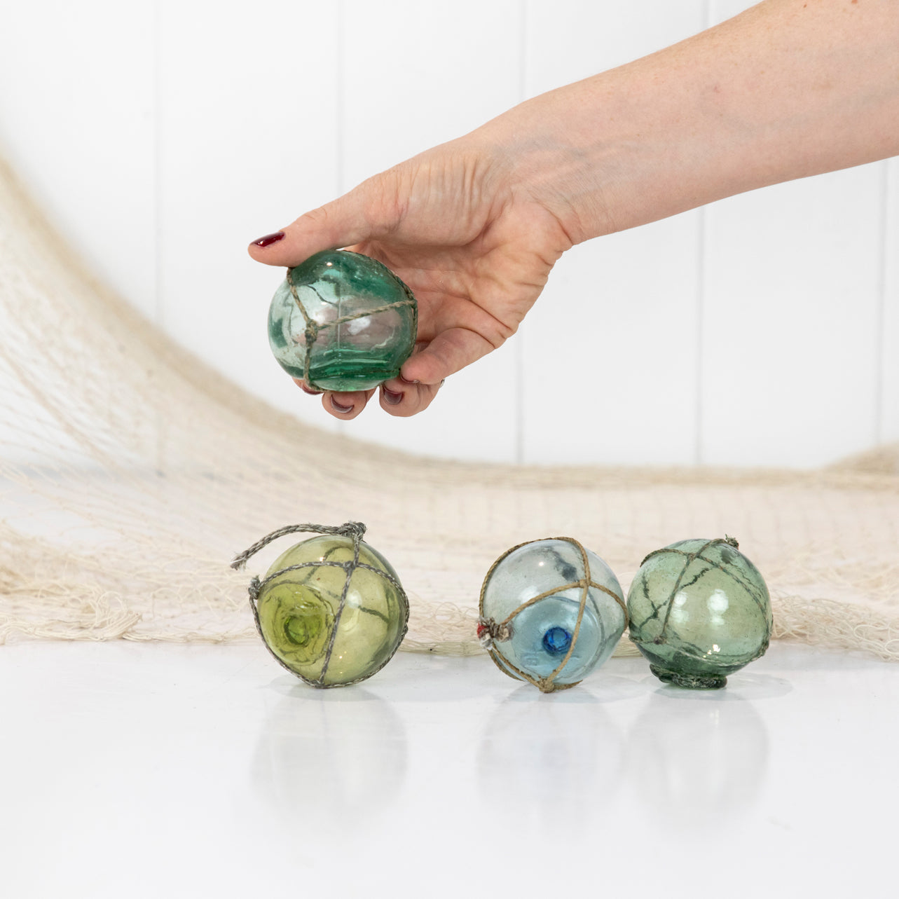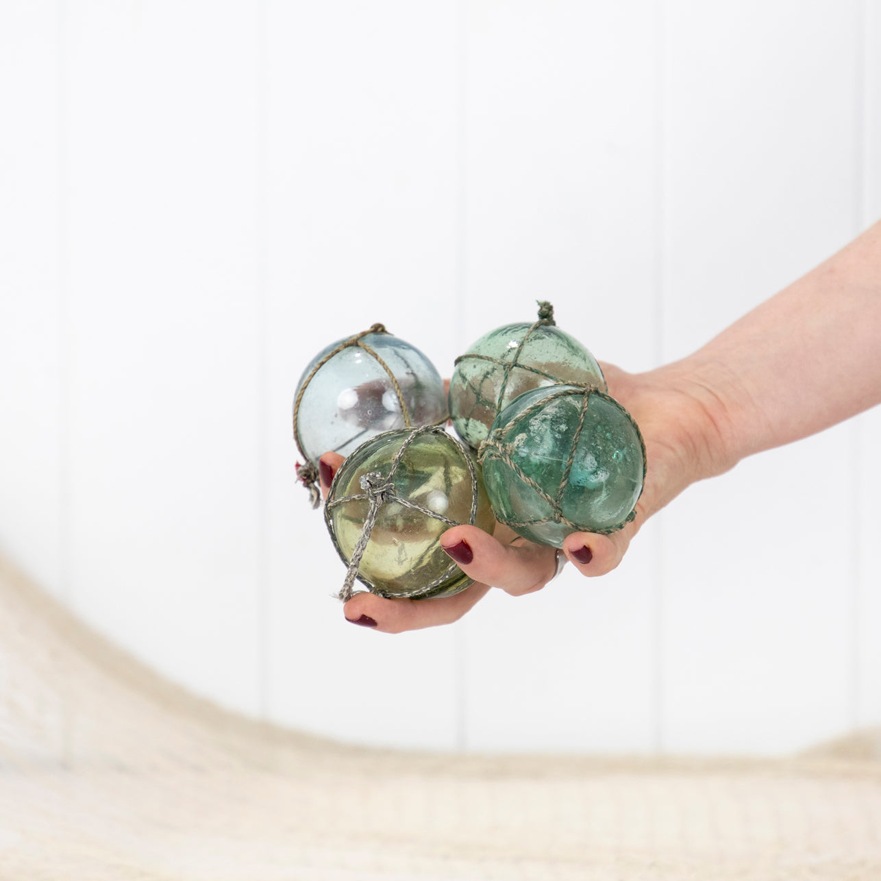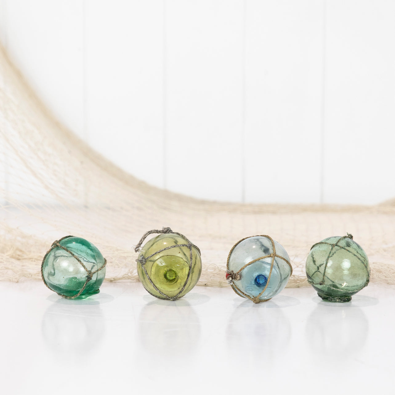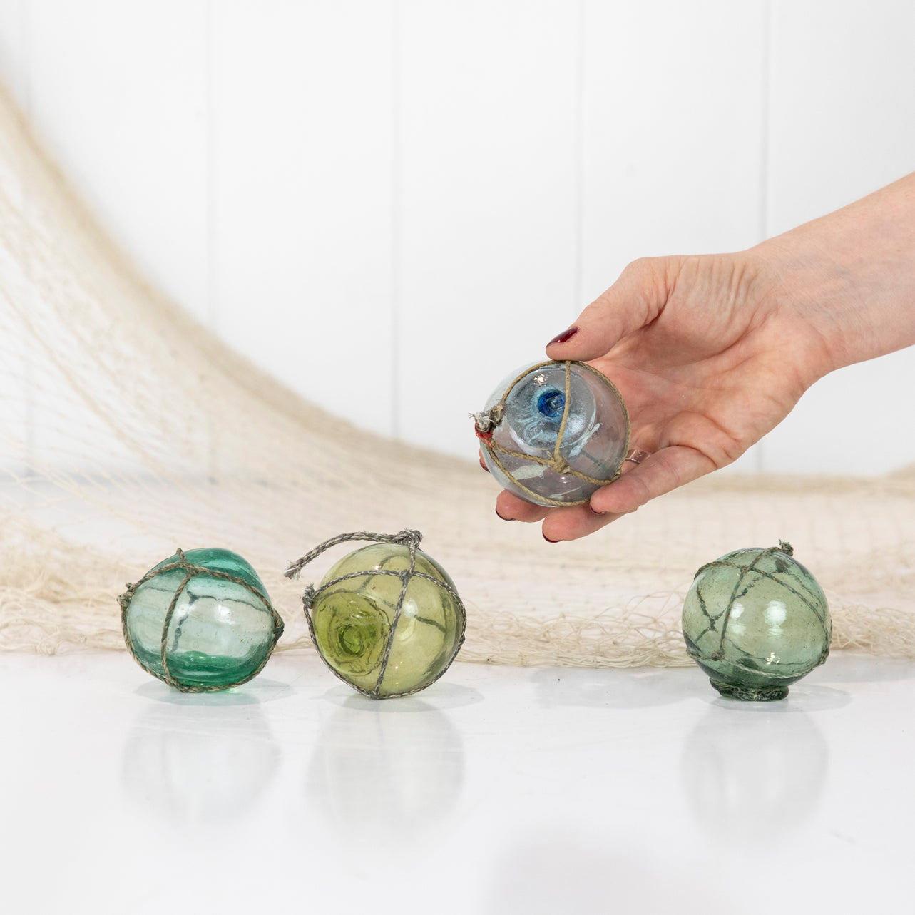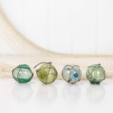 These Japanese glass floats are around 2inch in size. They would once have lined the edge of a fishing net.