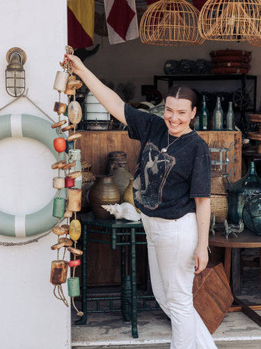 Perfect for hanging on the wall to create a beach shack vibe, each strand has a random arrangement of fishing buoy inspired timber shapes in soft muted tones.