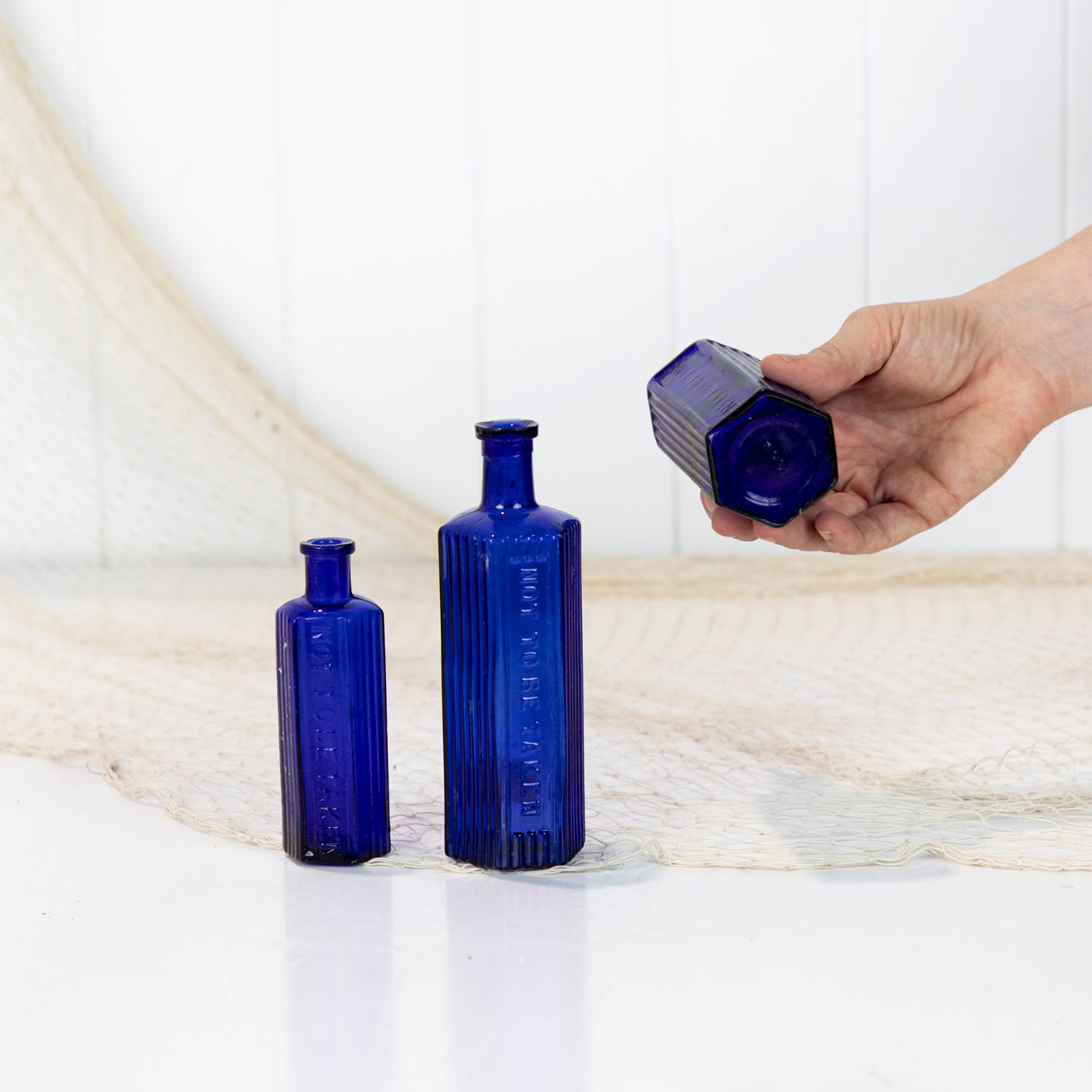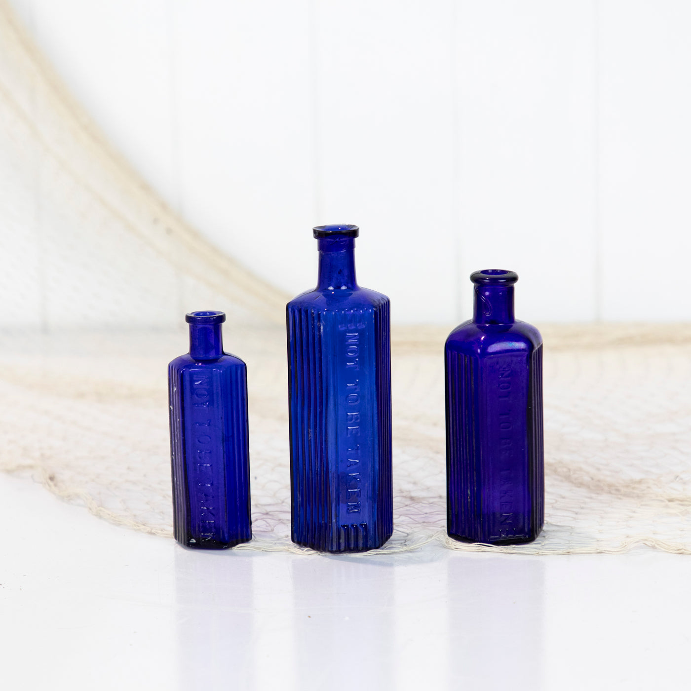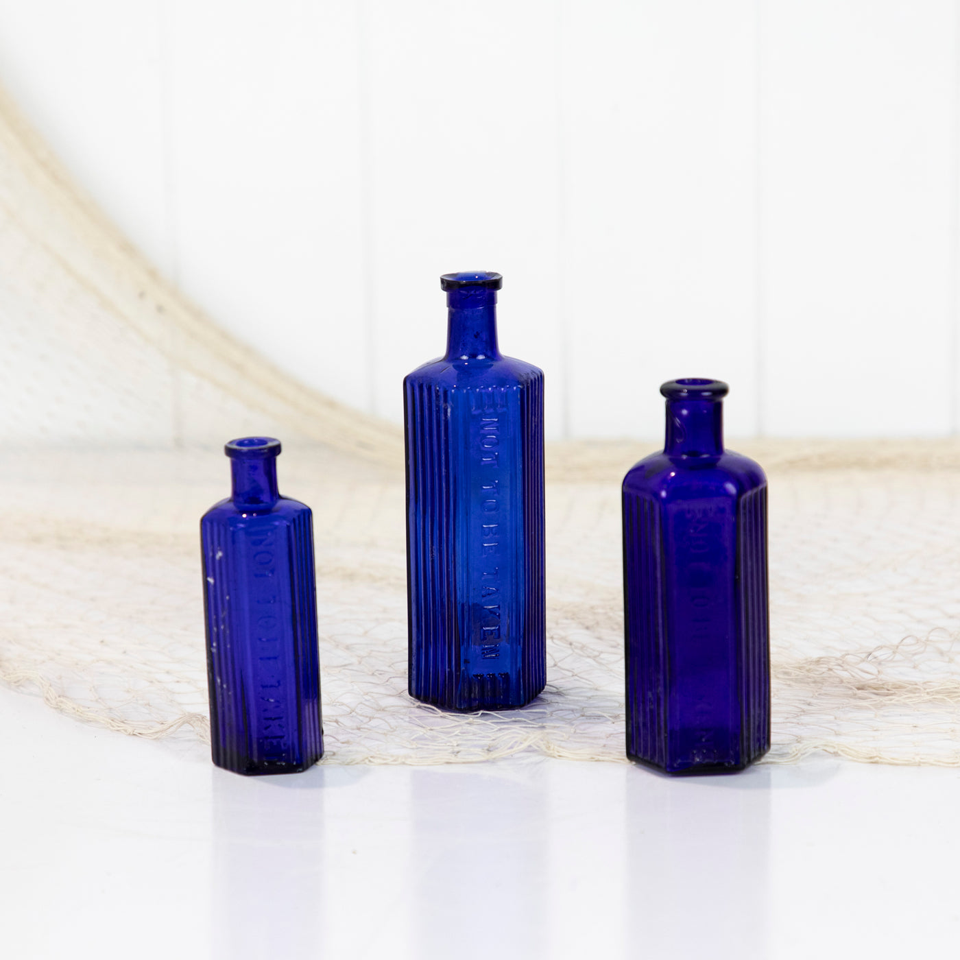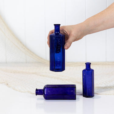 This set of three poison bottles are a fabulous vibrant cobalt blue. This colour is becoming increasingly rare to find!